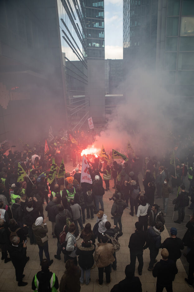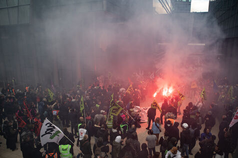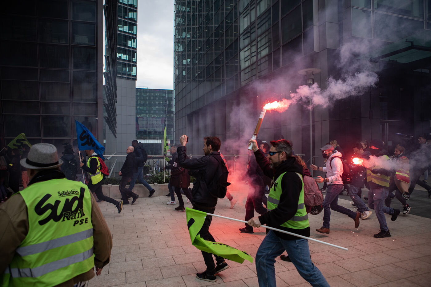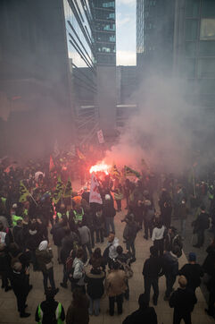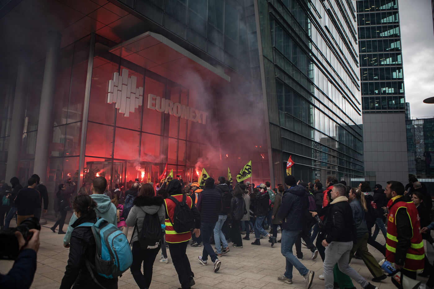 Action of the railway workers. They invade the Euronext tower, the Bourse de la Défense against the pension reform.