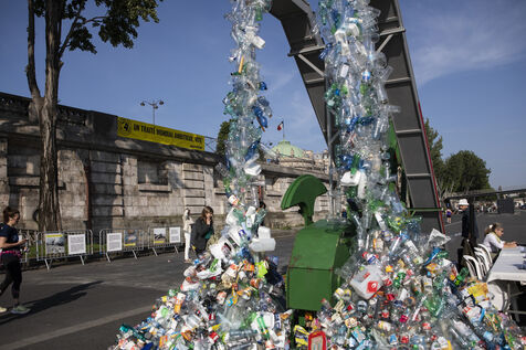 Greenpeace International dévoile une installation artistique géante de Benjamin Von Wong devant le musée d'Orsay, à l'approche des négociations sur le traité mondial sur les plastiques.