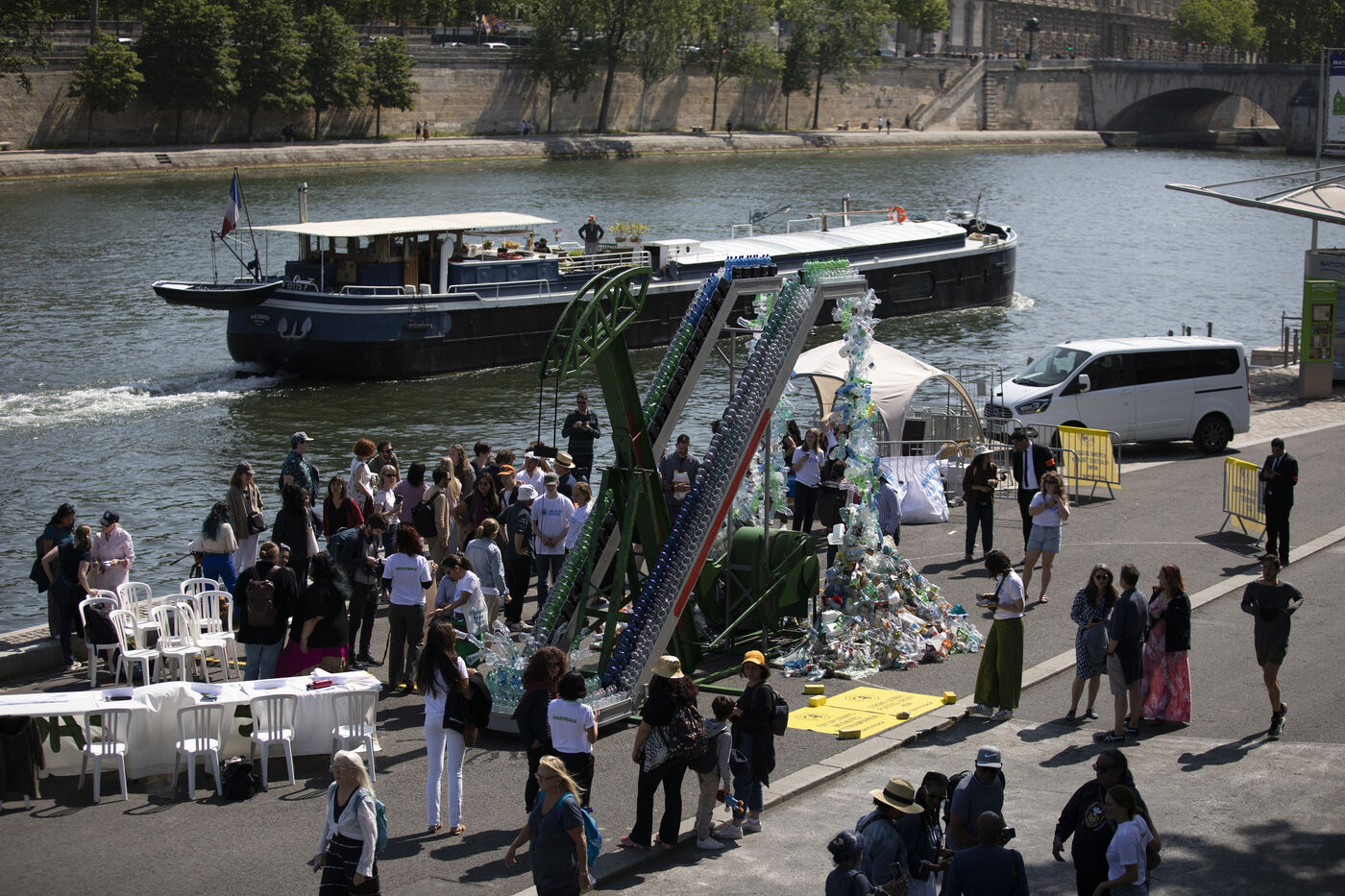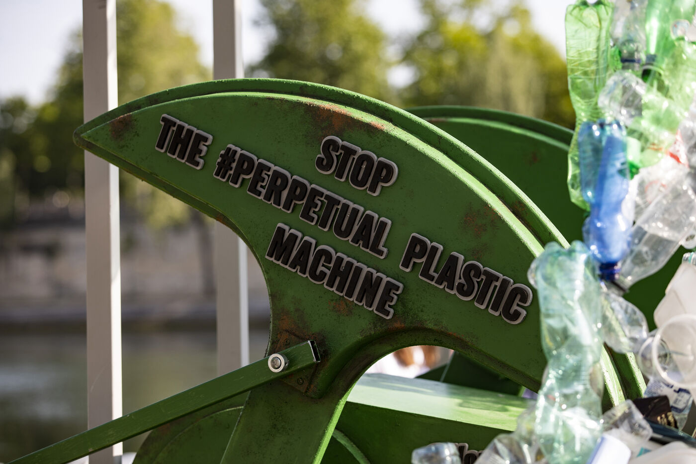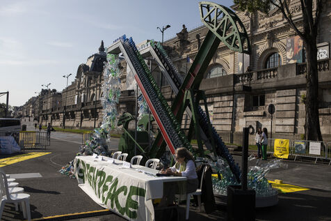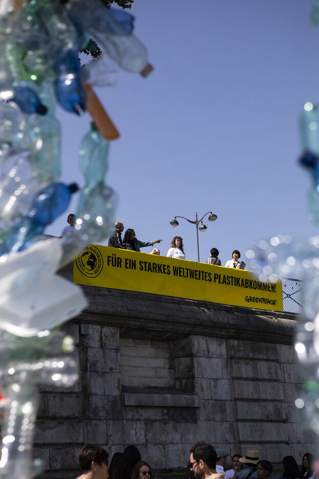 Greenpeace International unveils a giant art installation by Benjamin Von Wong in front of the Musée d'Orsay, in the run-up to the global plastics treaty negotiations.