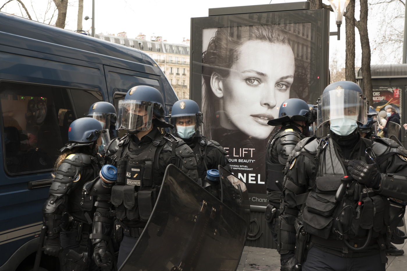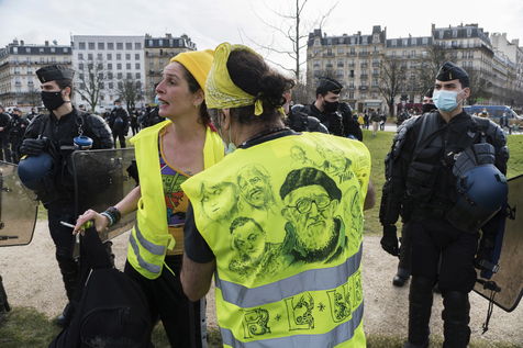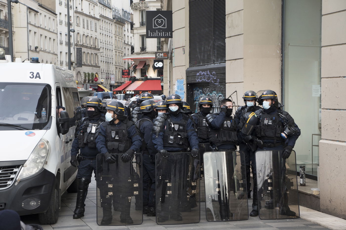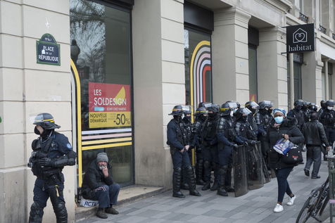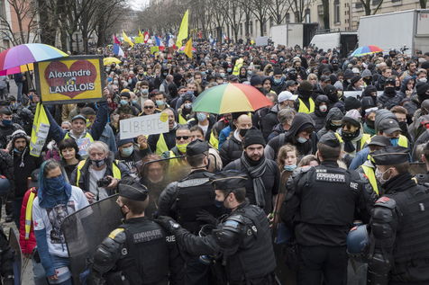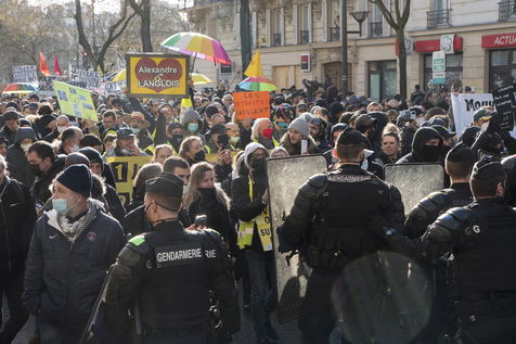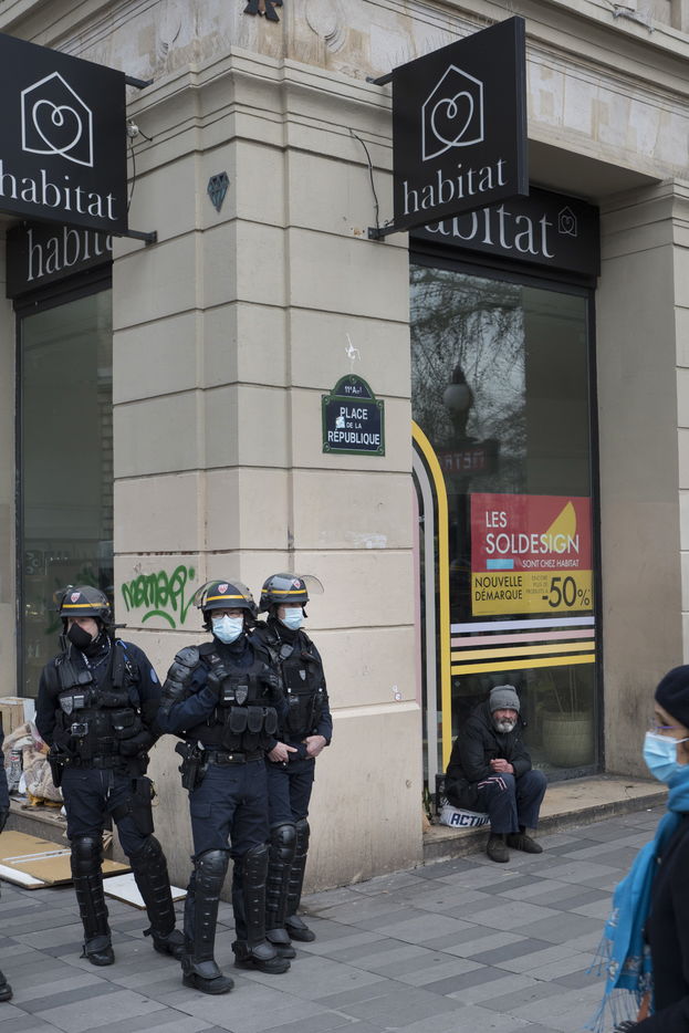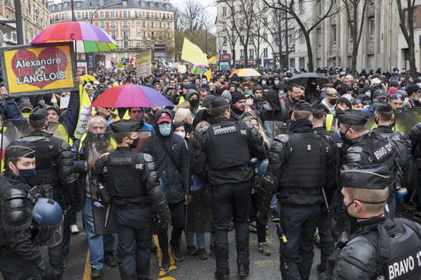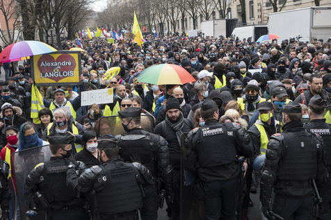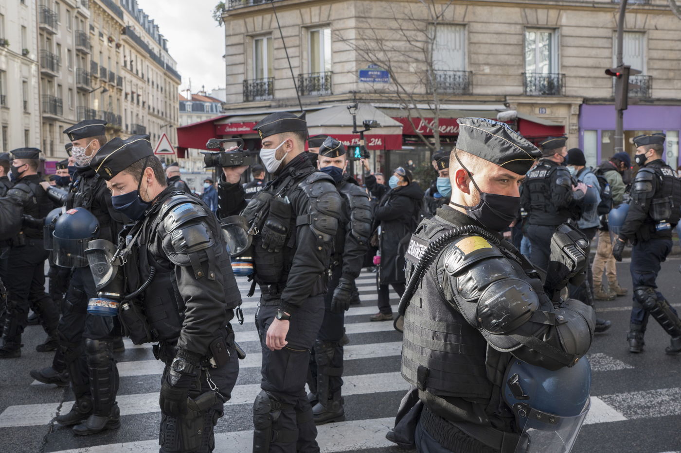Strong police presence during the demonstration. Thousands of demonstrators in France gathered for the Unitary March of Freedoms to protest against French law, Article 24 of Global Security, bans the publication of images identifying French police officers. Journalists and rights groups criticized the new law