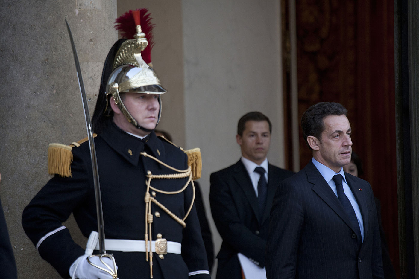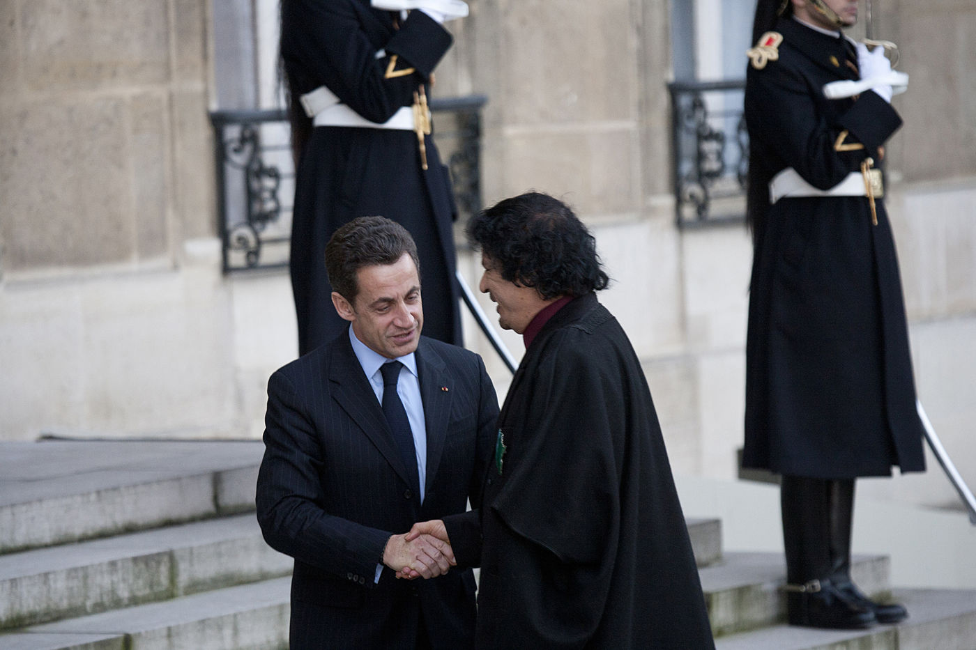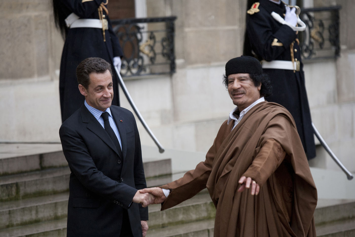 Colonel Muammar al-Gaddafi, who has been de-facto leader of Libya since 1969 is welcomed on his visit to Paris by the invitation of French President Nicolas Sarkozy at the Elysee Presidence.