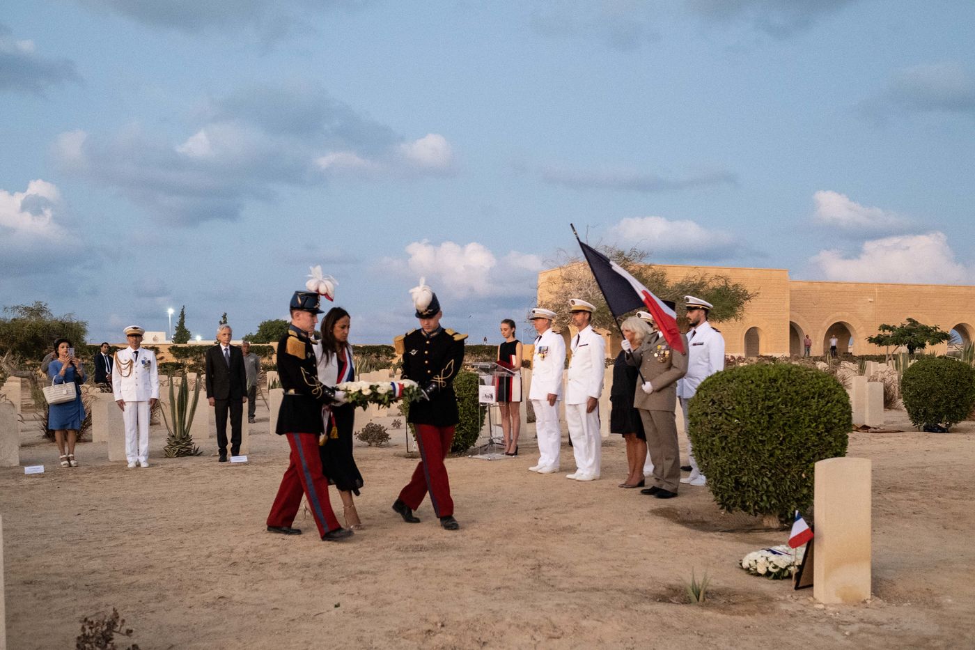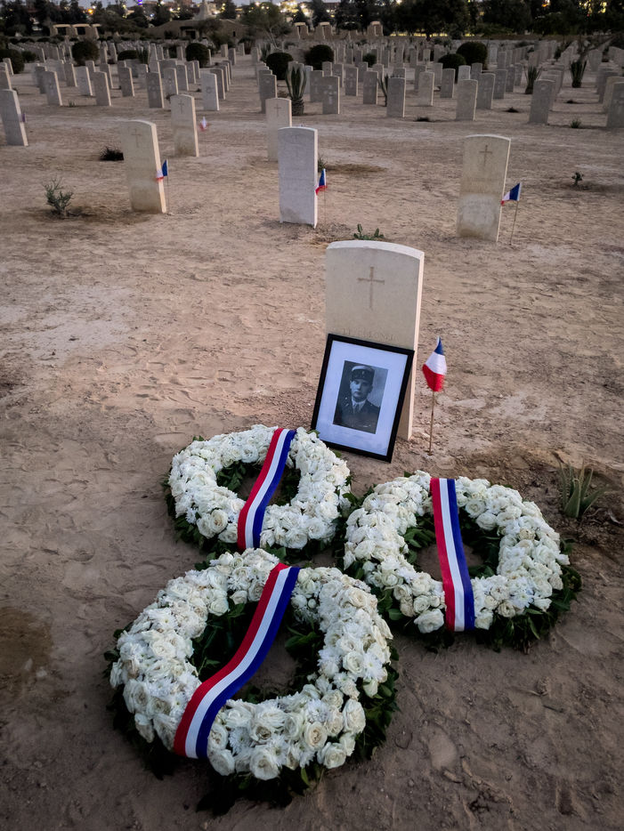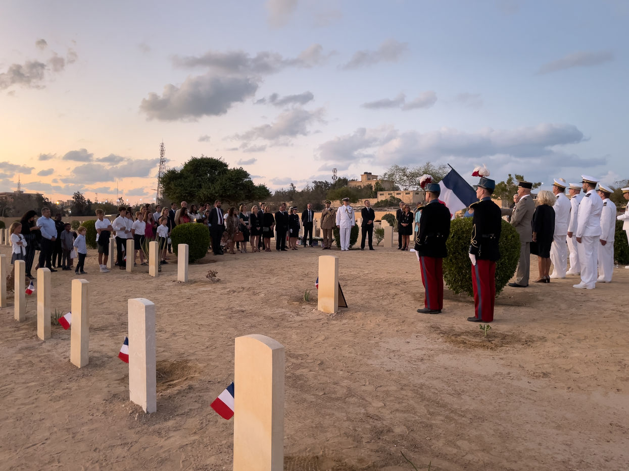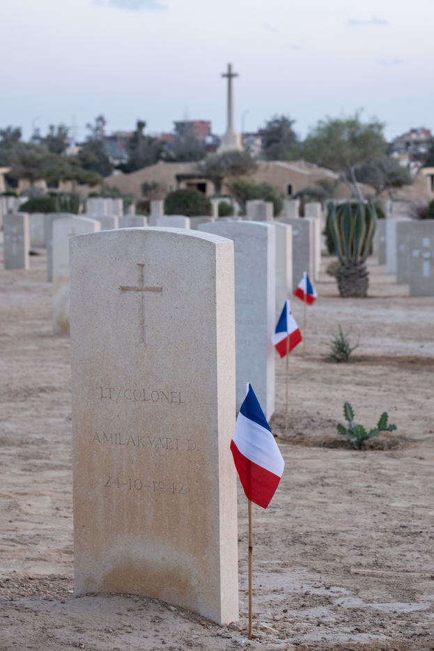 La France organisait cette annee une ceremonie tres intime, en amont de la ceremonie generale. Organisee par la mission de defense en Egypte, elle s est deroulee dans le carre francais du cimetiere du Commonwealth, au pied de la tombe du lieutenant Amilakvari, une des figures mythiques de la legion etrangere. C est ici que se trouve la majorite des 53 soldats francais qui y sont enterres.