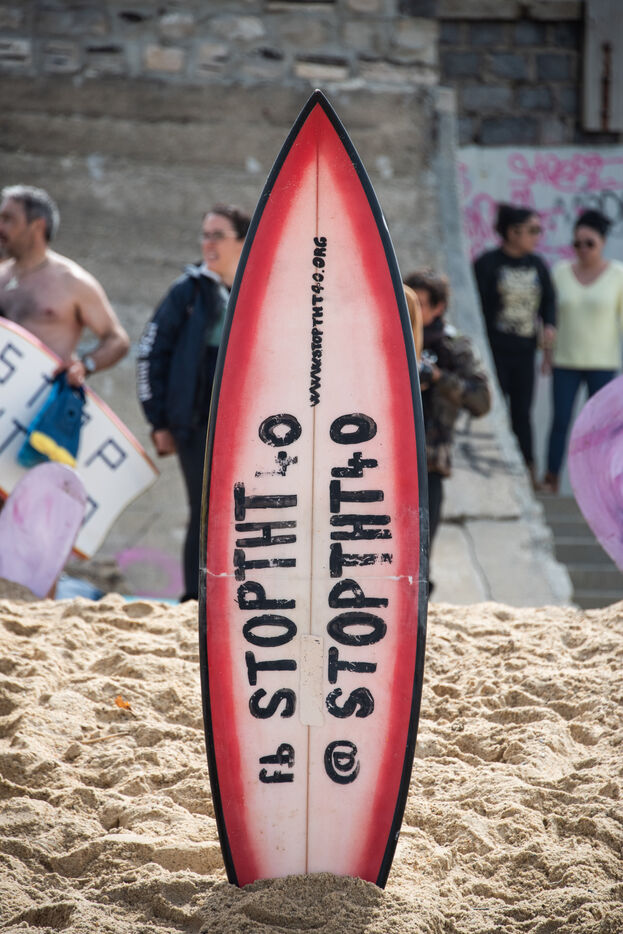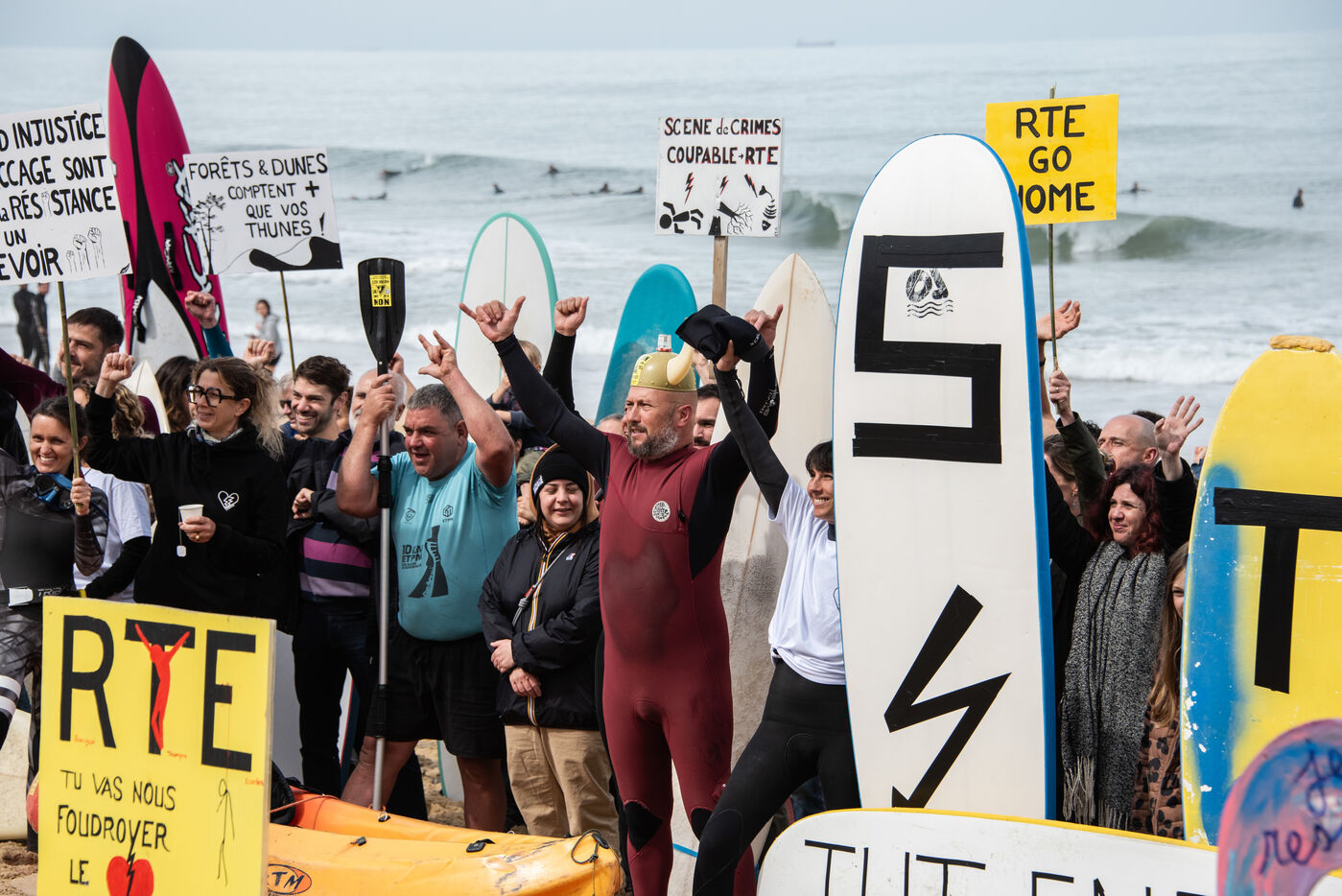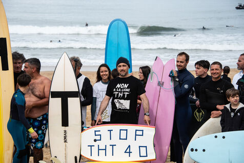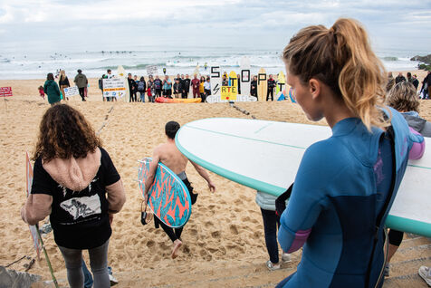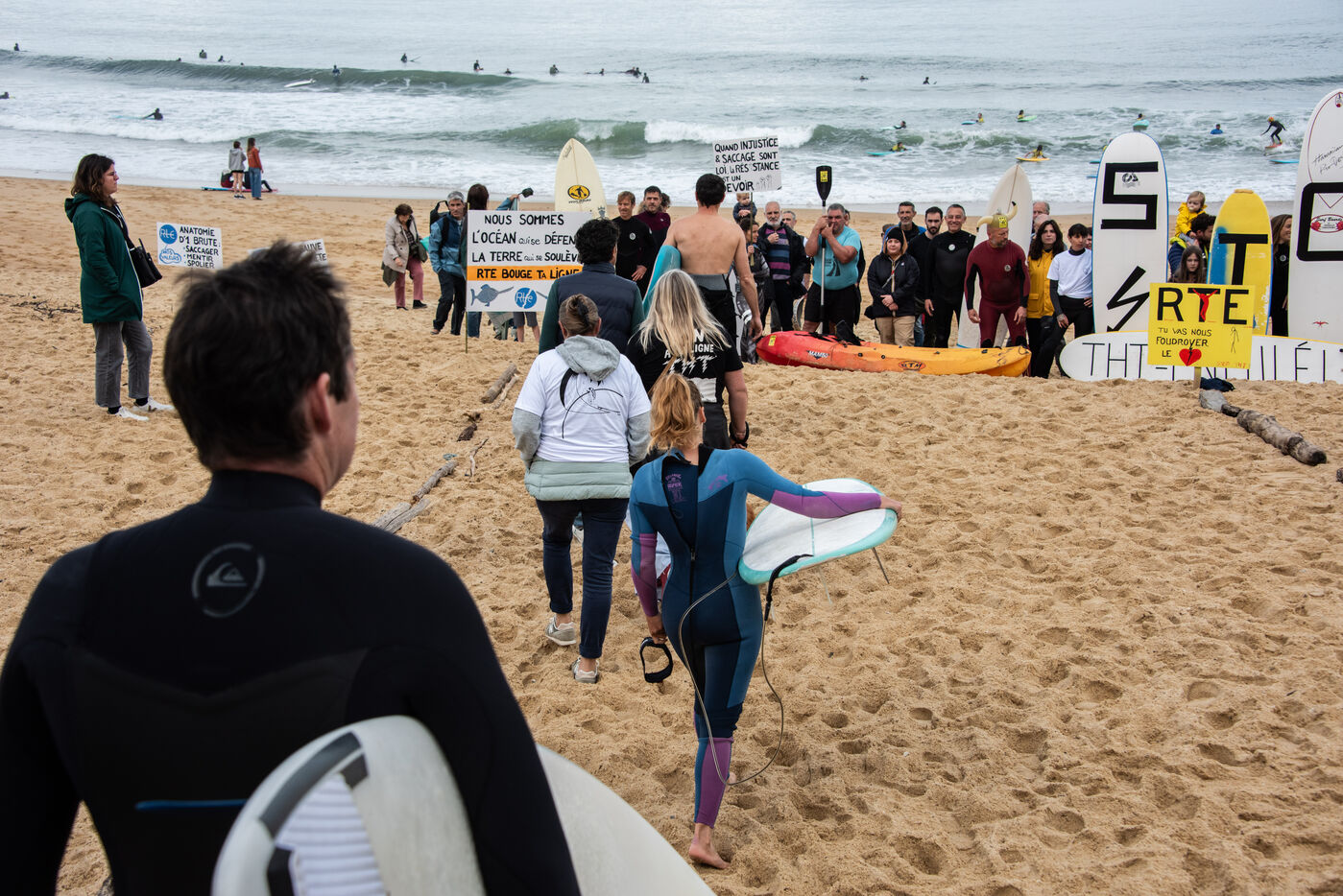 Citizens gathered again, this time in Capbreton, to fight against the RTE project. This time, surfers jumped into the water and participated in their own way. Maud Le Car and Joan Duru took part. As well as artist Tom Frager