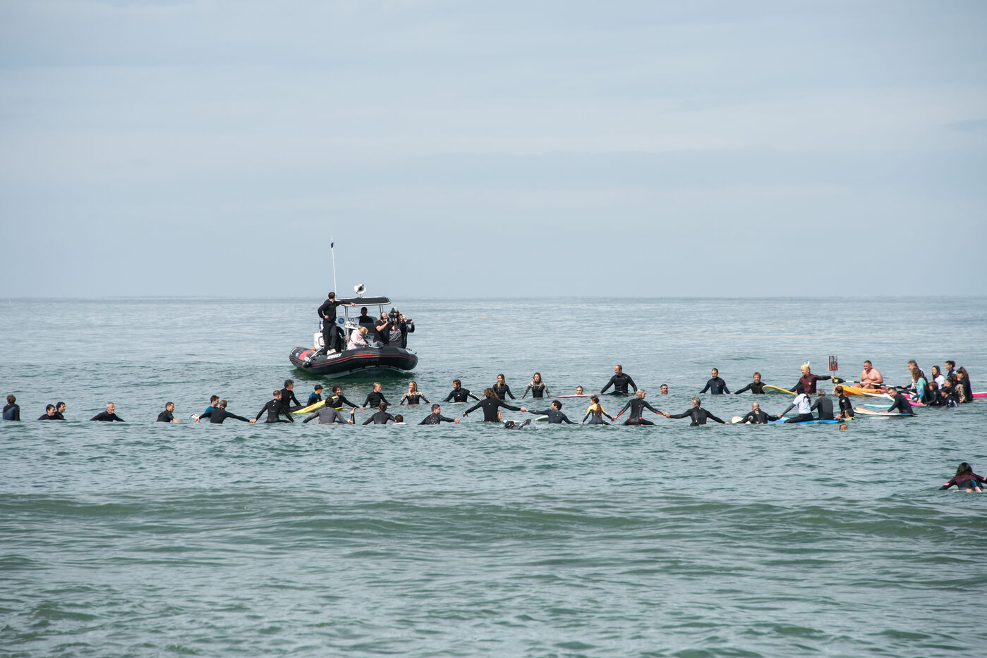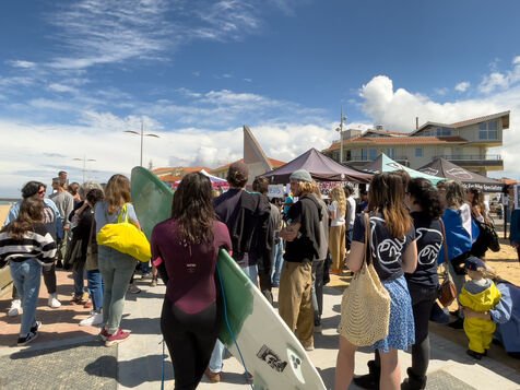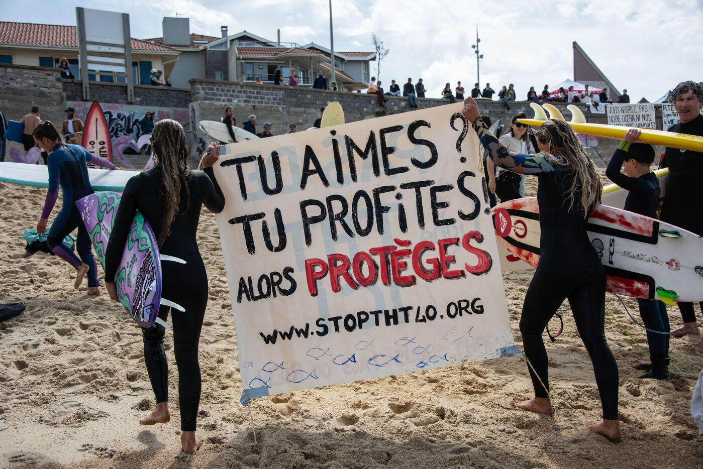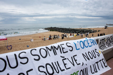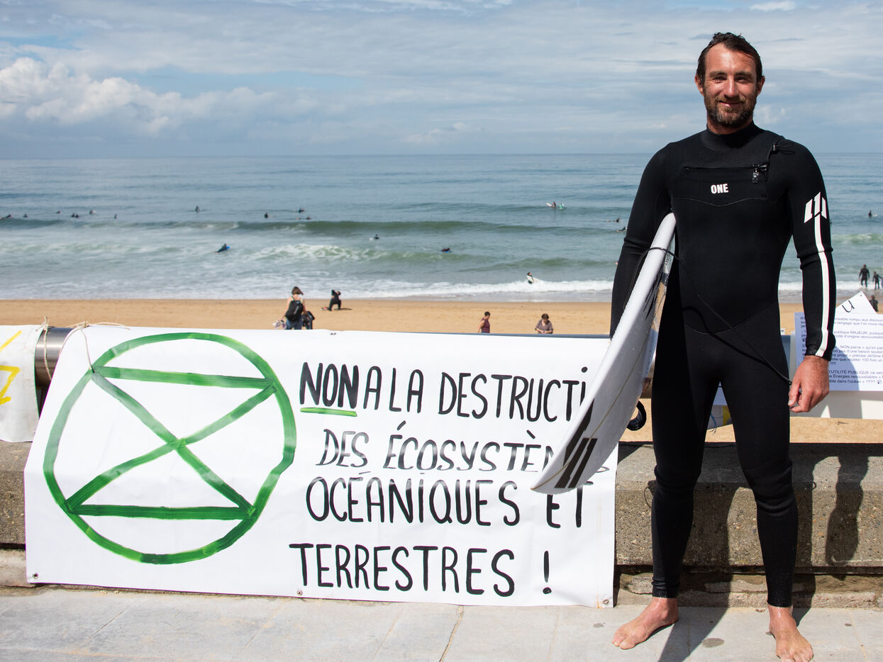Citizens gathered again, this time in Capbreton, to fight against the RTE project. This time, surfers jumped into the water and participated in their own way. Maud Le Car and Joan Duru took part. As well as artist Tom Frager