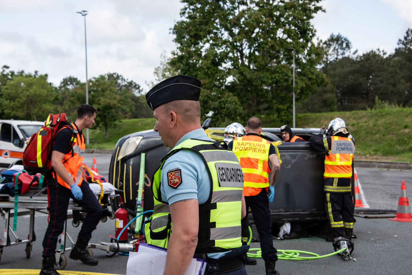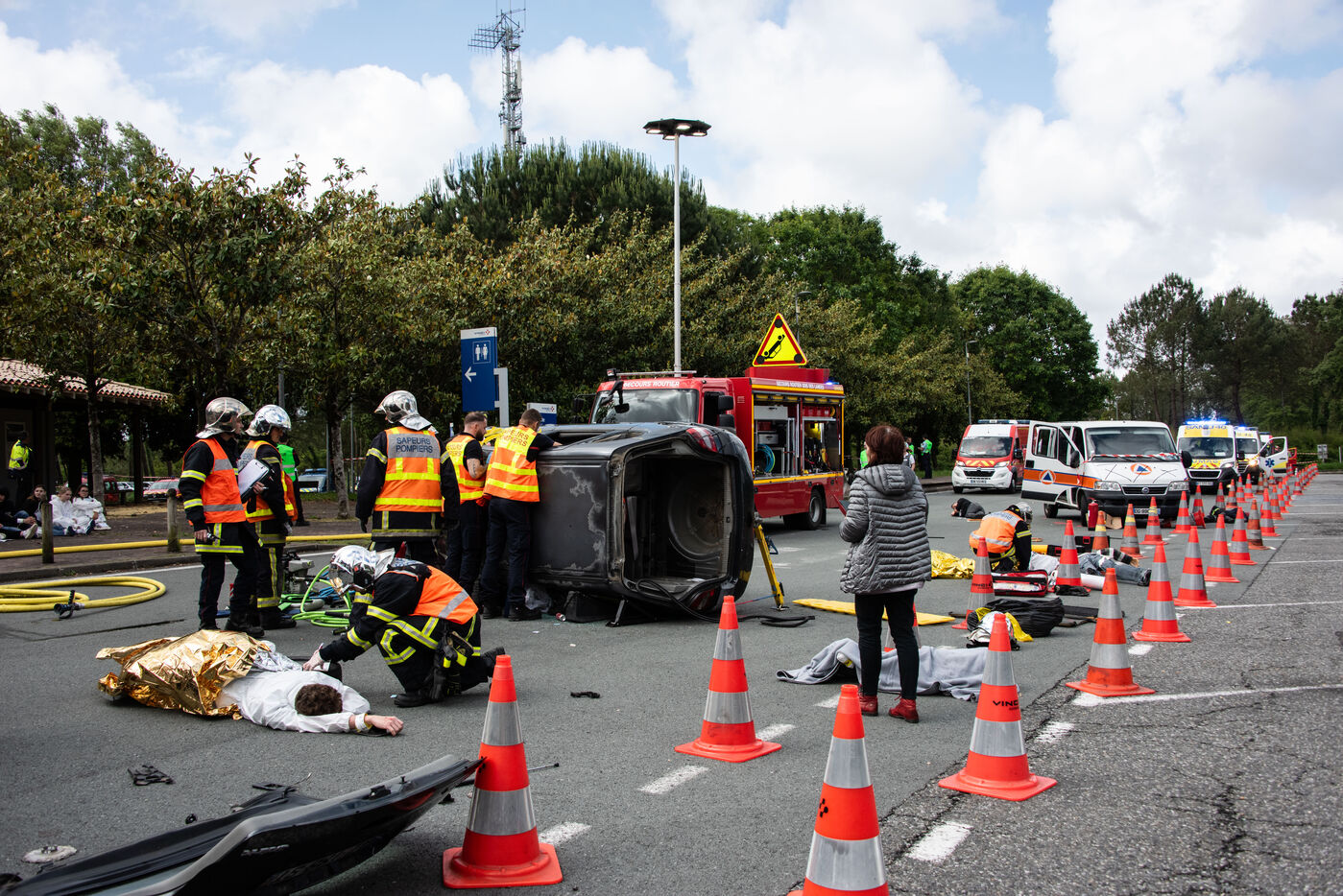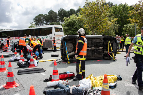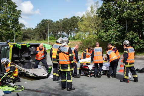 Prefecture, gendarmes, firefighters, SDIS, Samu, command center, Protection Civile etc. from several towns in the Landes region, took charge of various accident cases (simulated by high school students, among others). The organization and handling of the scenarios were filmed and monitored by facilitators and observers, before being debriefed.