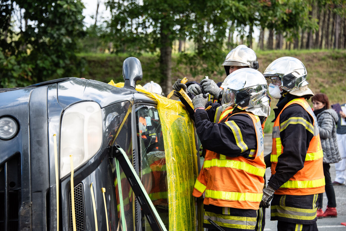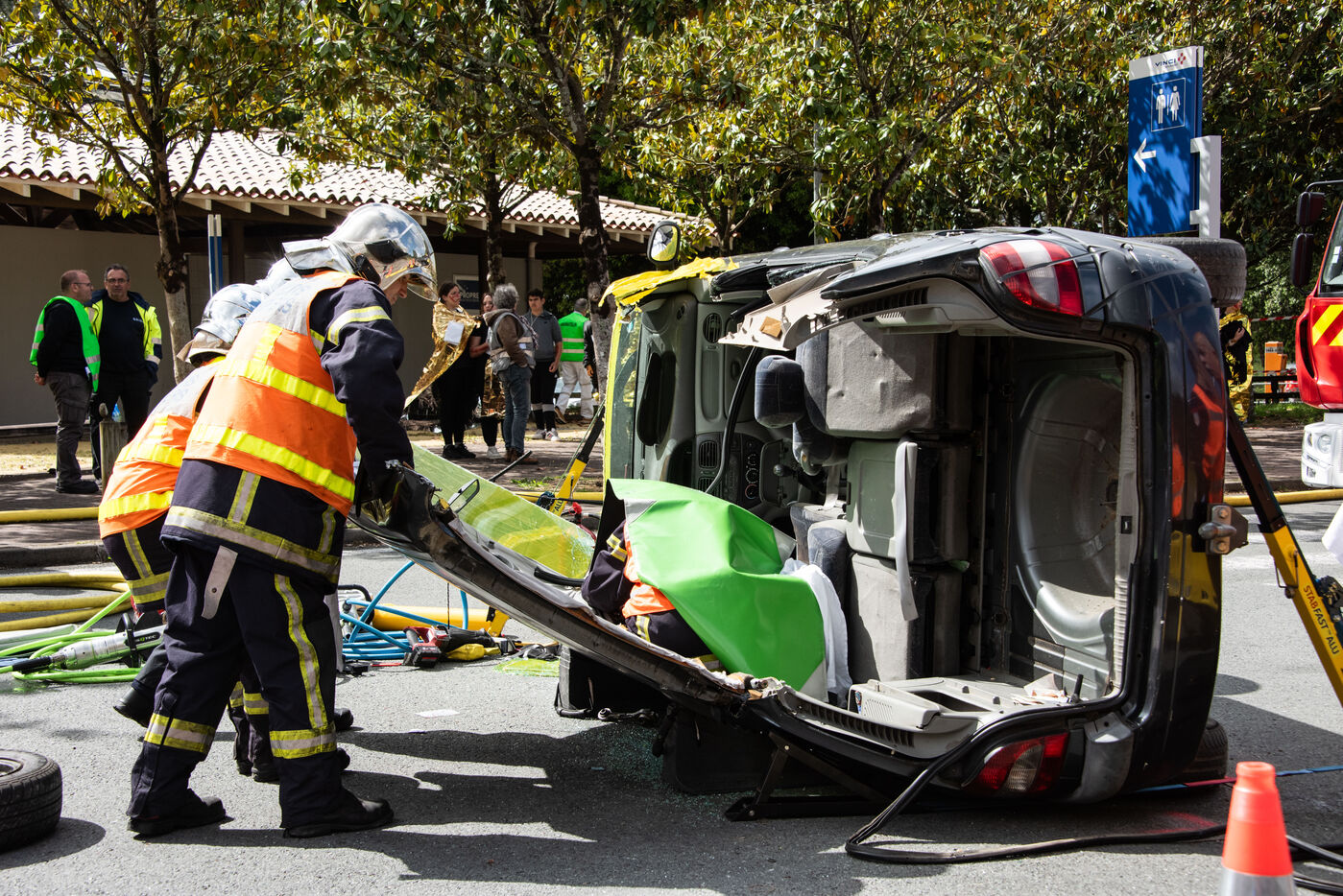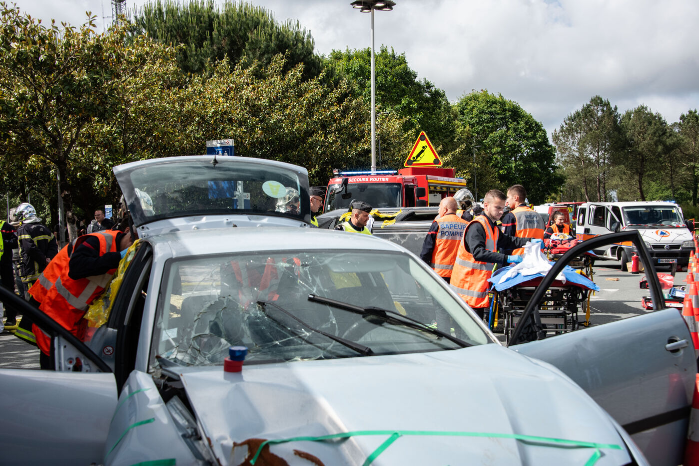 Prefecture, gendarmes, firefighters, SDIS, Samu, command center, Protection Civile etc. from several towns in the Landes region, took charge of various accident cases (simulated by high school students, among others). The organization and handling of the scenarios were filmed and monitored by facilitators and observers, before being debriefed.