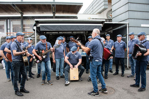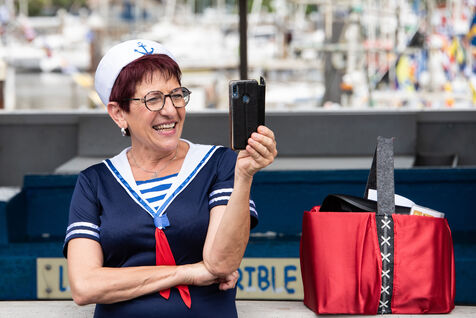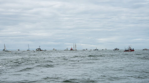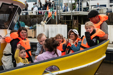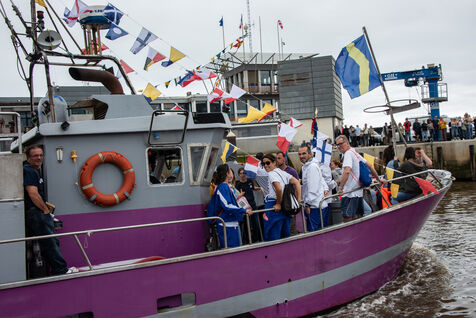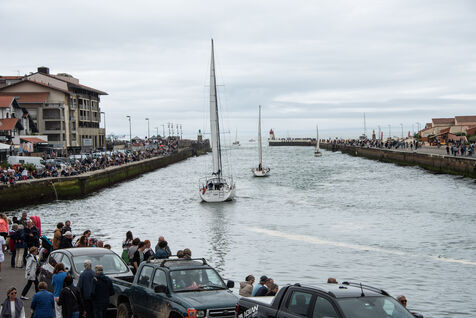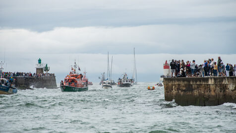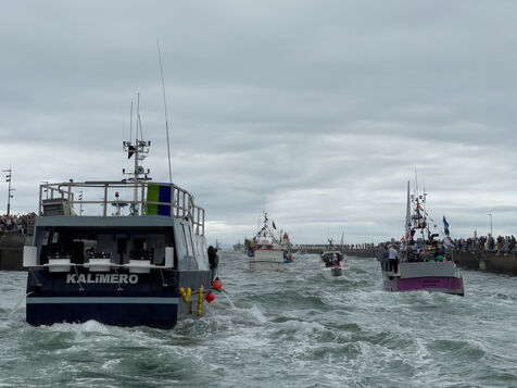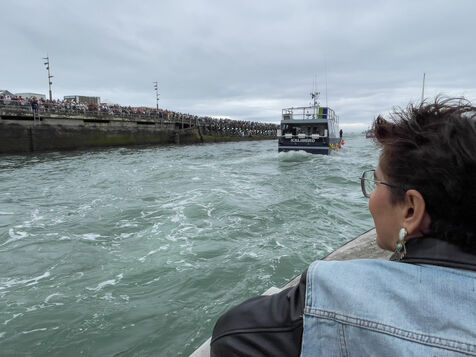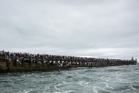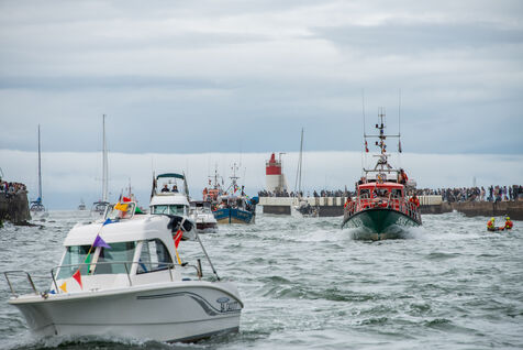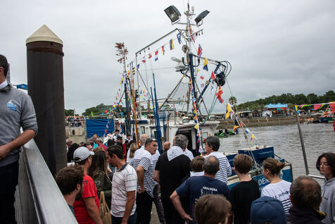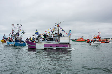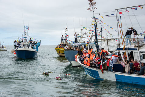 Le deuxième jour, traditionnellement, les marins-pêcheurs sortent en mer en procession et se regroupent aux large pour lancer des couronnes de fleurs en mémoire des marins ayant péri en mer. Les visiteurs sont nombreux à venir assister à la sortie en mer, par cette après-midi sans pluie.