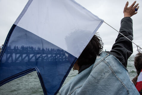 On the second day of the festival, fishermen traditionally go out to sea in procession and gather off the coast to throw wreaths in memory of sailors who have perished at sea. On this rainless afternoon, many visitors come out to watch the procession.
