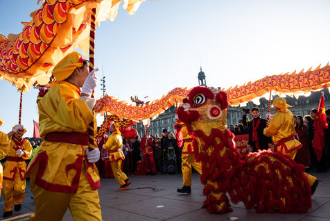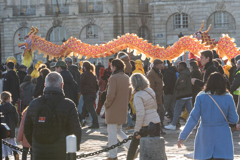Starting in the Place de la Victoire, it ended with a gathering at the Miroir d'Eau for the traditional lion and dragon dance. A large crowd gathered for the occasion, under the late afternoon winter sun.