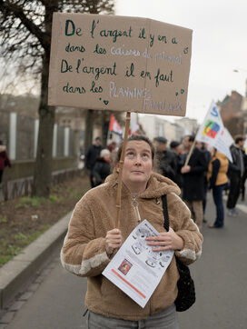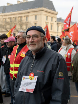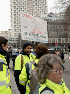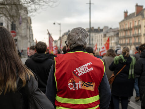 Manifestation pour l'emploi et l'industrie à Rennes (Ille-et-Vilaine) le 12 décembre 2024. Les manifestants protestaient contre les plans sociaux mis en place dans de nombreuses sociétés françaises. À date du 12 décembre, 300 000 emplois étaient menacés ou avaient déjà été perdus, selon le cabinet Altares, qui dénombrait 300 plans sociaux.