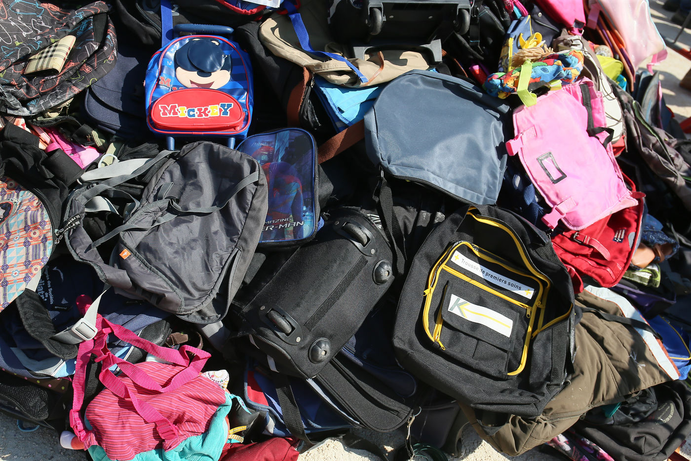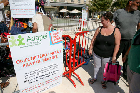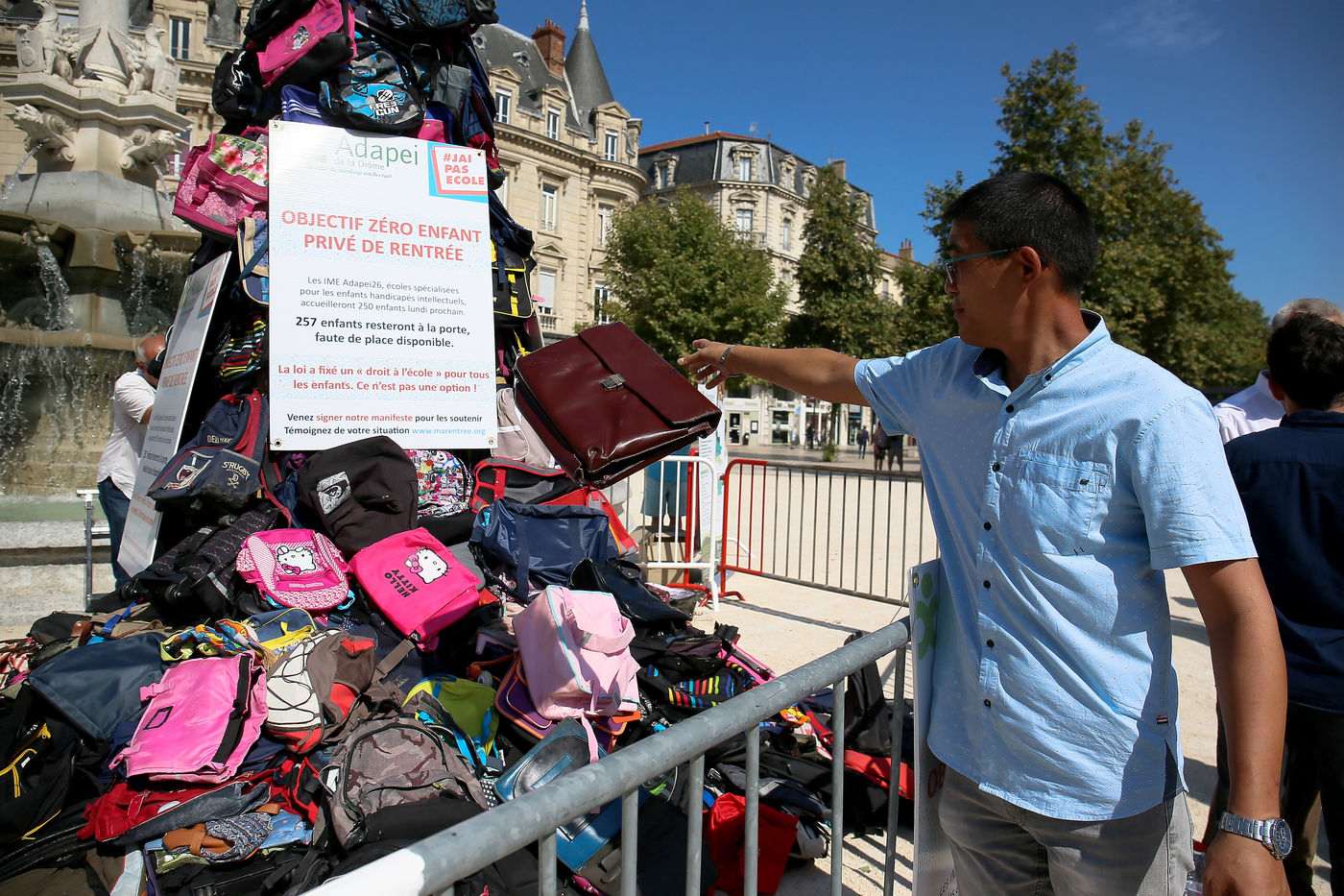 Opération symbolique de pyramide de cartables devant la fontaine monumentale de Valence a l'initiative de l?ADAPEI de la Drôme. La structure dénonce la situation de 257 enfants handicapes mentaux qui seront privés de rentrée scolaire dans la Drôme cette année faute de place disponible dans les quatre instituts médico-educatifs (IME) du département.