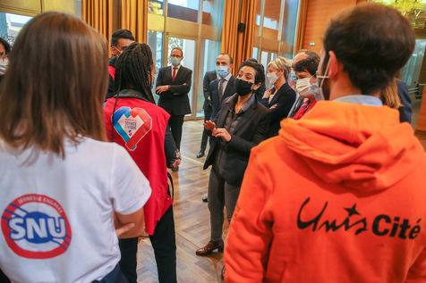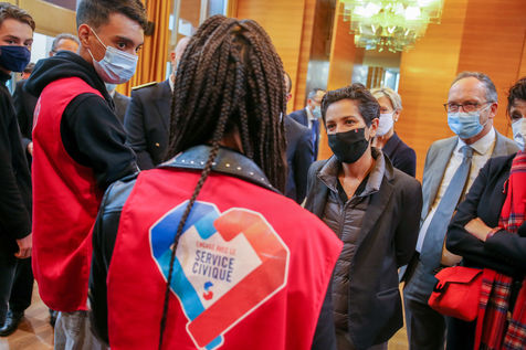 Sarah El Haïry, secrétaire d?État chargée de la Jeunesse et de l?Engagement auprès du ministre de l'Éducation nationale, de la Jeunesse et des Sports, rencontre une dizaine de jeunes qui réalisent une mission de service civique. Avec le plan 1 jeune 1 solution, ce sont 100 000 missions supplémentaires de service civique qui seront mises en place en 2020-2021.