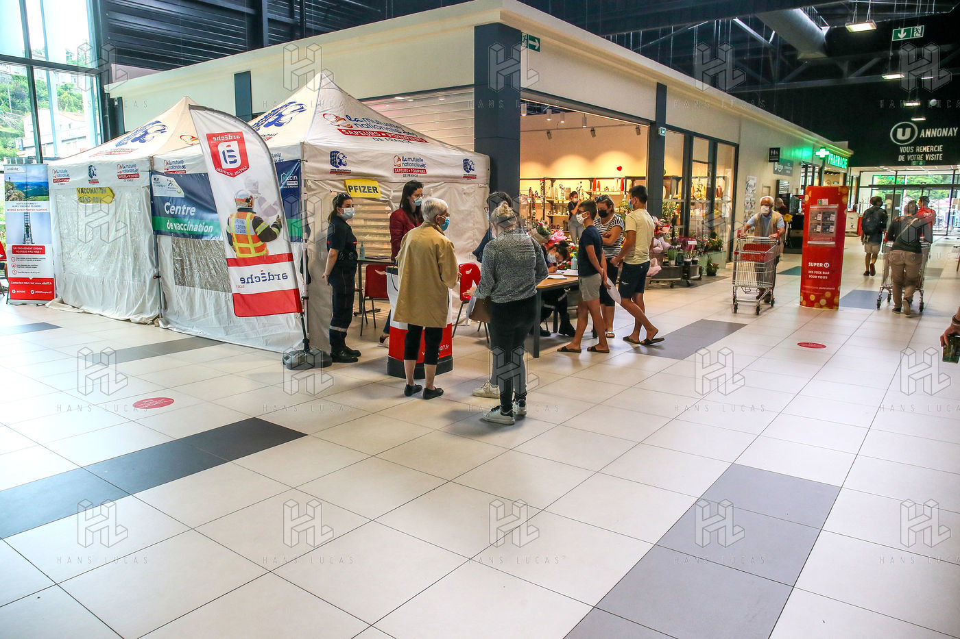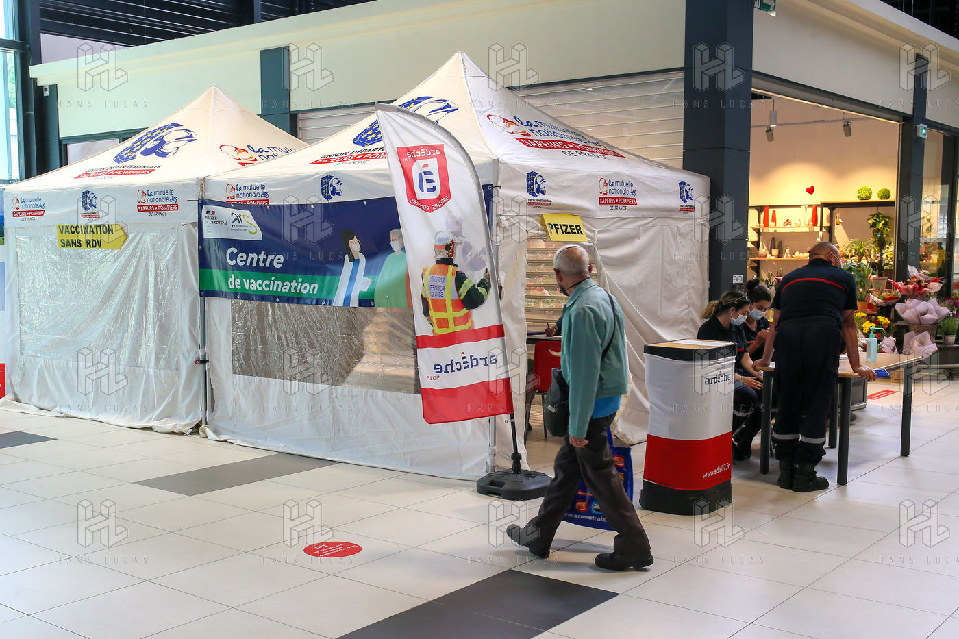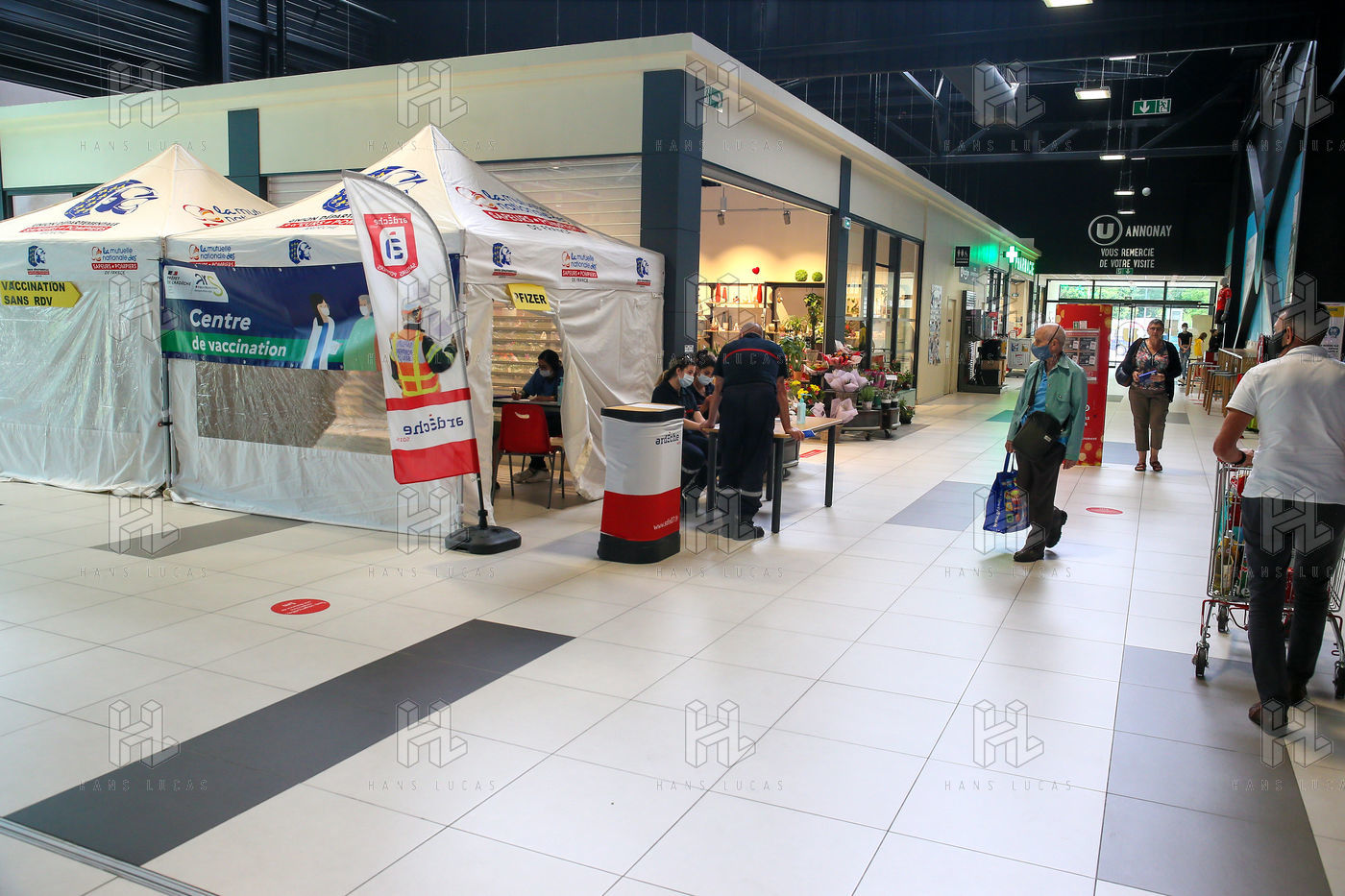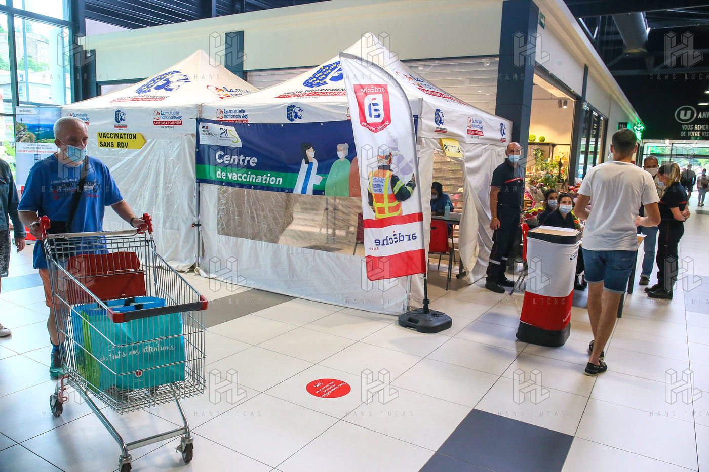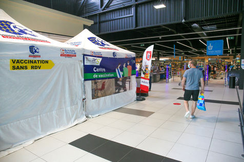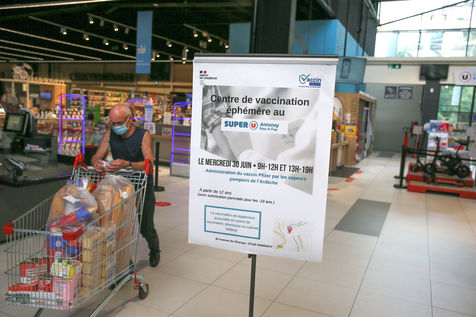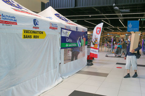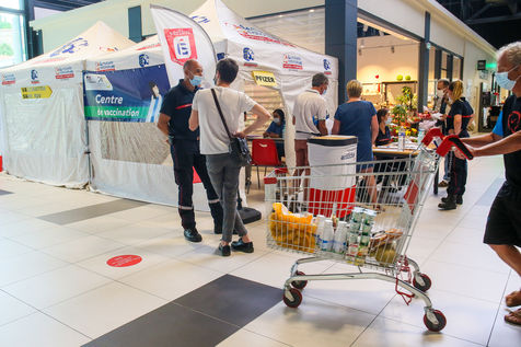 Pour encourager la vaccination contre le Covid 19, l'ARS de l'Ardèche et les Sapeurs Pompiers organisent une séance de vaccination sans rendez-vous dans la galerie marchande d'un supermarché Super U.