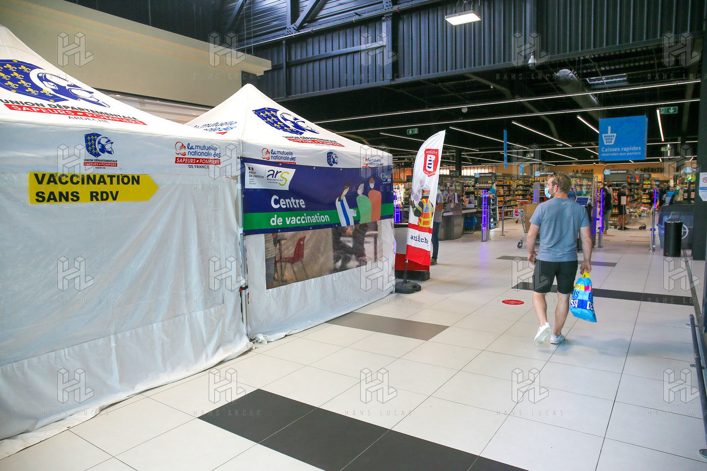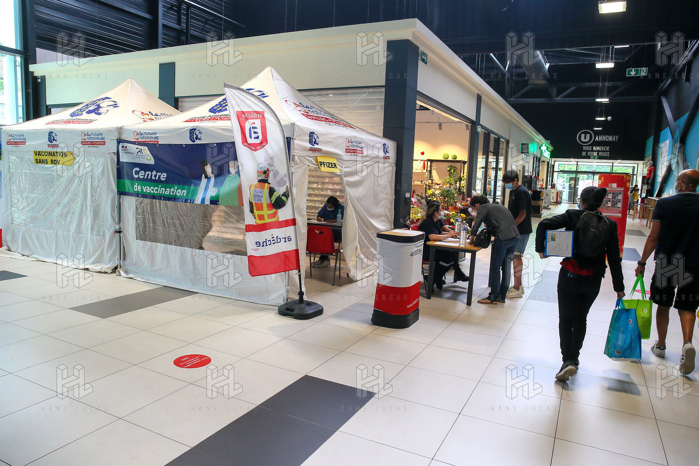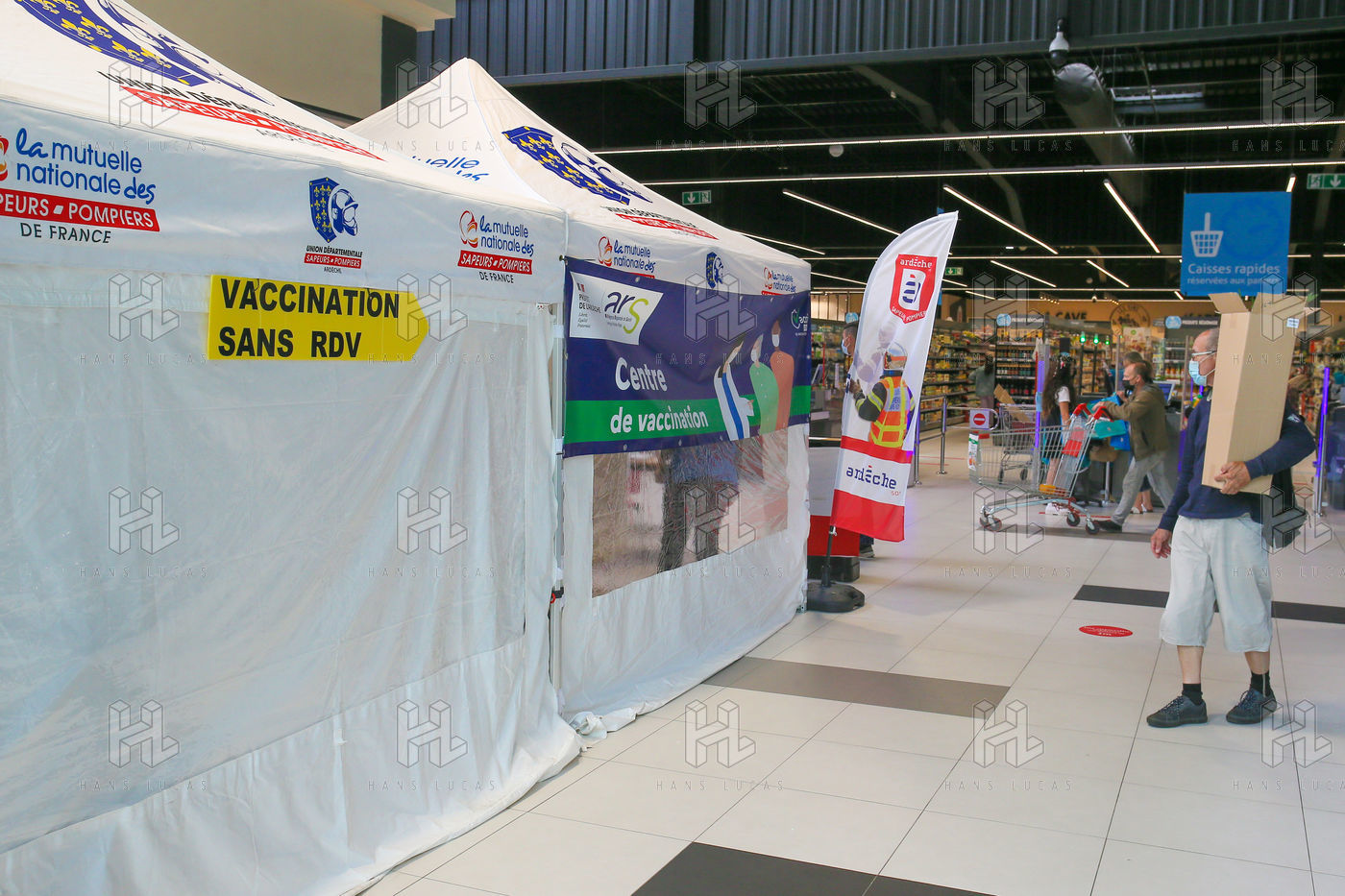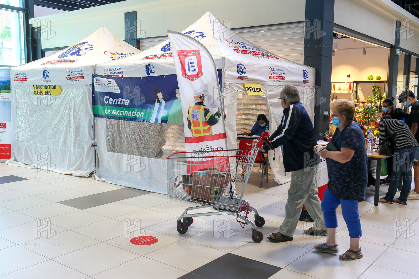 Pour encourager la vaccination contre le Covid 19, l'ARS de l'Ardèche et les Sapeurs Pompiers organisent une séance de vaccination sans rendez-vous dans la galerie marchande d'un supermarché Super U.