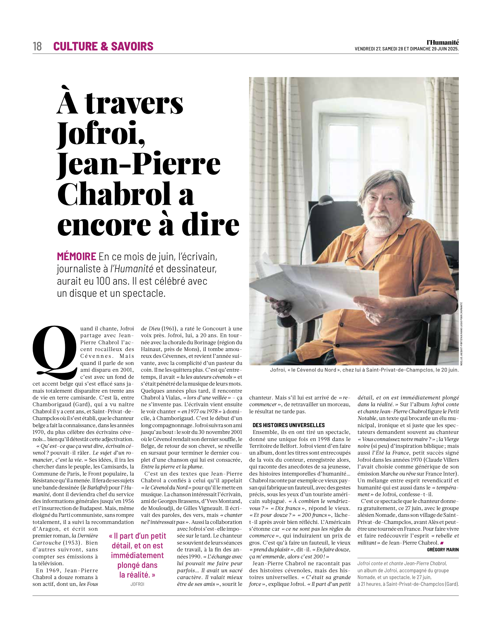 Noëllie Jacquot-Portefaix Publications Séries / Archive Culture — Environnement — Politique — Société — Spiritualité — Sélection de séries Santé Magazine, 03/09/2025 Reporterre, 18/07/2025 L'Humanité, 27/06/2025. La Vie, 28/11/2024 La Croix L'Hebdo, 26/10/2024 Nouvel Obs, 19/07/2024 Nouvel Obs, conférence, 18/07/2024 Mediapart, reportage 22/06/2024 La Vie, Portrait, 20/06/2024 Hiam Abbass pour l'Humanité, 02/05/2024 Mediapart, reportage 27/04/2024 La Vie, reportage Portrait, Santé Magazine n. 580 Santé Magazine n. 580 Libération, Portrait Suzanne, 13/11/2023 Libération, Portrait Clémentine et Suzanne, 13/11/2023 Le Parisien, le ministre de la Santé Aurélien Rousseau à Saint-Hilaire-De-Brethmas, 25/08/2023. Proteste, mars 2023 Revue Mission, Georgina Dufoix Midi Libre