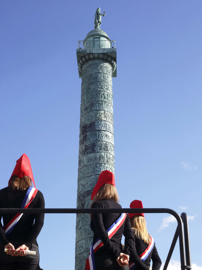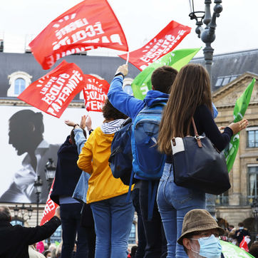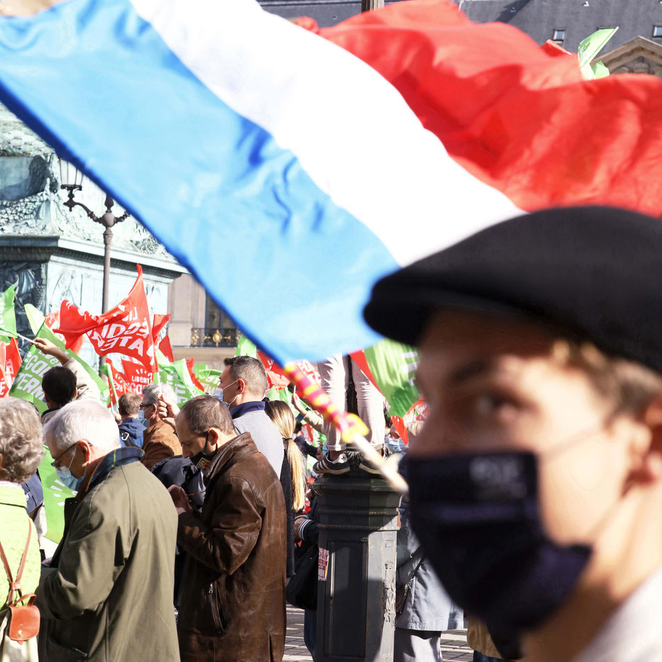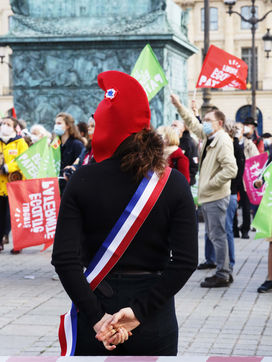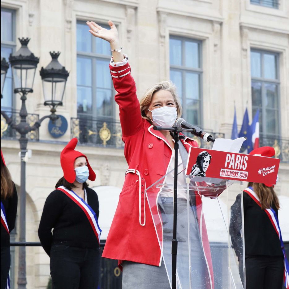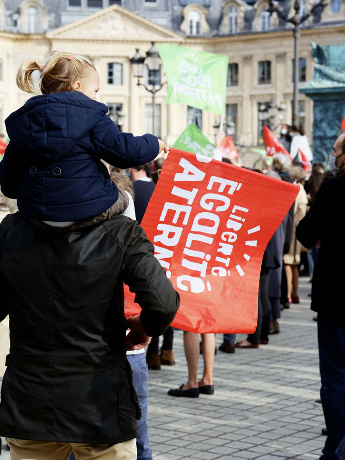 Gathering of supporters of "La Manif Pour Tous" in Place Vendôme in Paris on Saturday, October 10, 2020 in front of the Ministry of Justice. With as main speaker, Ludivine de la Rochère to defend fatherhood and oppose medically assisted reproduction (MAP) for all women, and the bioethics bill.