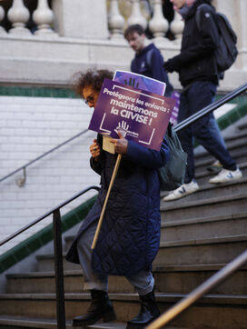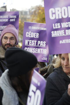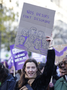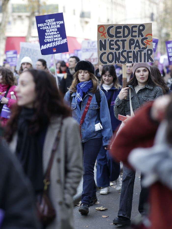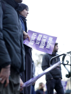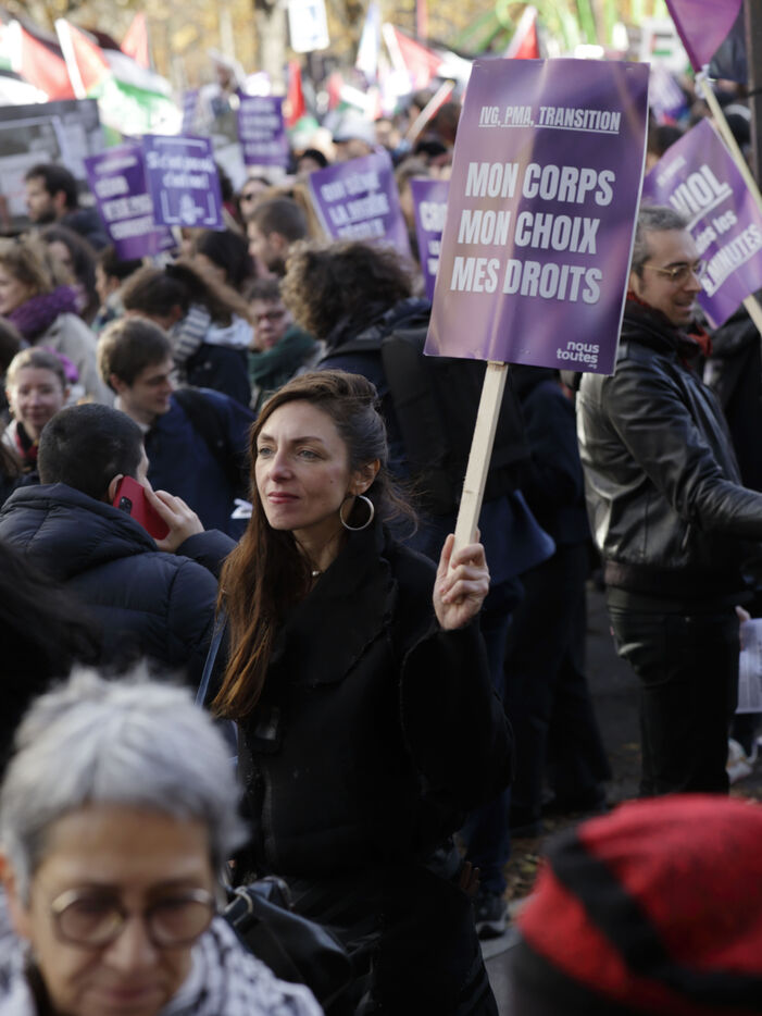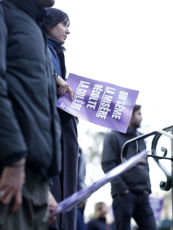 Grand march on November 25, 2023 for the international day for the eradication of violence against women. The march took place from the Place de la Nation to the Place de la République. At the head of the Parisian procession marched the families of feminicide victims, with portraits of their missing loved ones. Everywhere, the color purple dominated the procession.