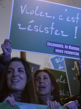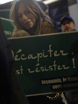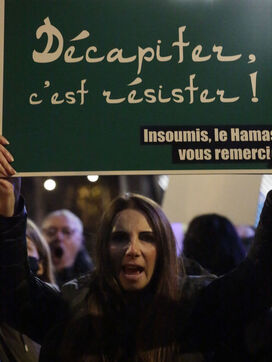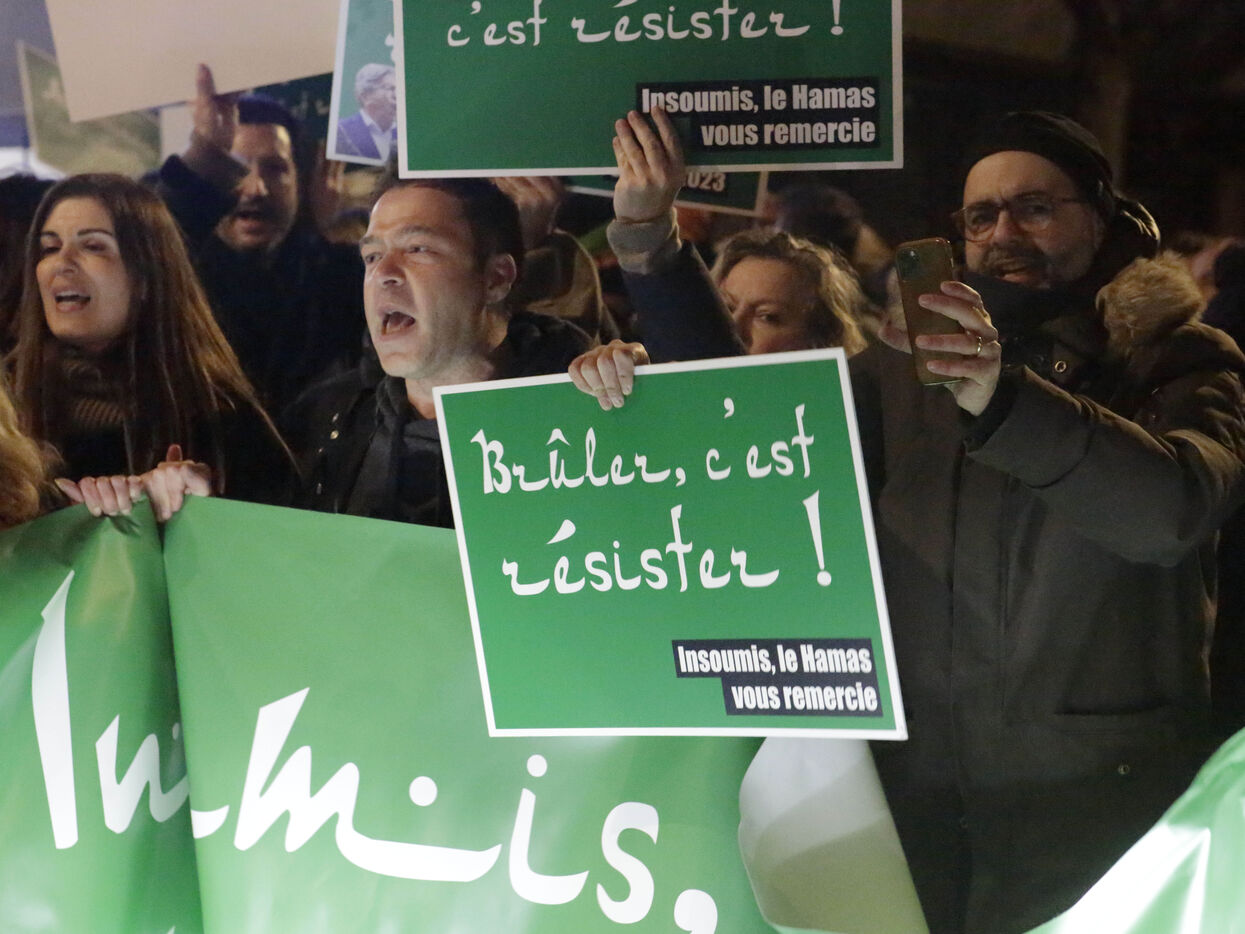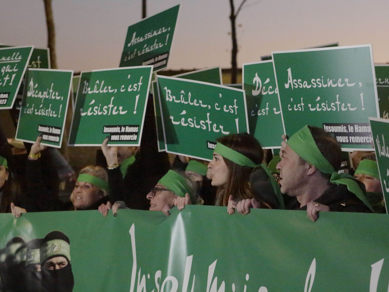 The "Nous Vivrons" collective turned out in front of the building where La France Insoumise was meeting, to challenge its stance on Hamas. Participants wore green headbands in reference to Hamas fighters, and held up placards with slogans such as "To burn is to resist" and "To murder is to resist" to denounce Jean-Luc Mélenchon's ambiguous stance on this organization.