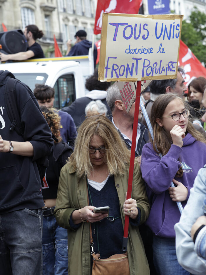 The results of the European elections put the Rassemblement National list, led by Jordan Bardella, in the lead. In response to this situation, Emmanuel Macron set up the National Assembly. For this new campaign, the various parties forged alliances. The Nouveau Front Populaire was born, bringing together a large number of left-wing parties. This coalition is made up of other union-type organizations, and they organized this demonstration on June 15, to call for a barrage against the RN.