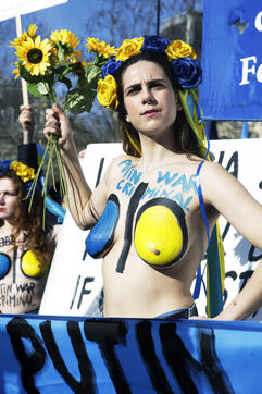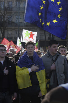 The Paris demonstration was attended by 3,500 people, according to the Prefecture de Police. The procession set off unfurling a 260-meter-long Ukrainian flag. The Femen feminist movement was present to mark the anniversary and denounce the situation with a banner: "If Russia stops fighting, there will be no more war. If Ukraine stops fighting, there will be no more Europe."The procession headed for the Place de la Bastille, where it was dispersed and political figures took the floor.