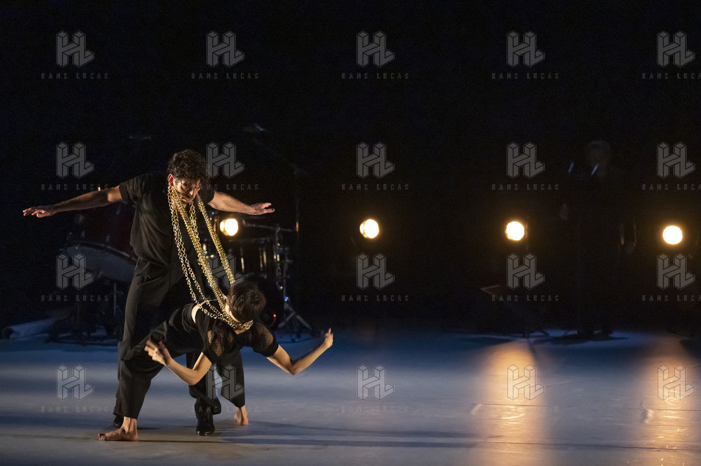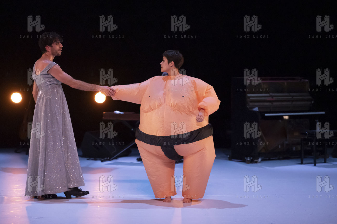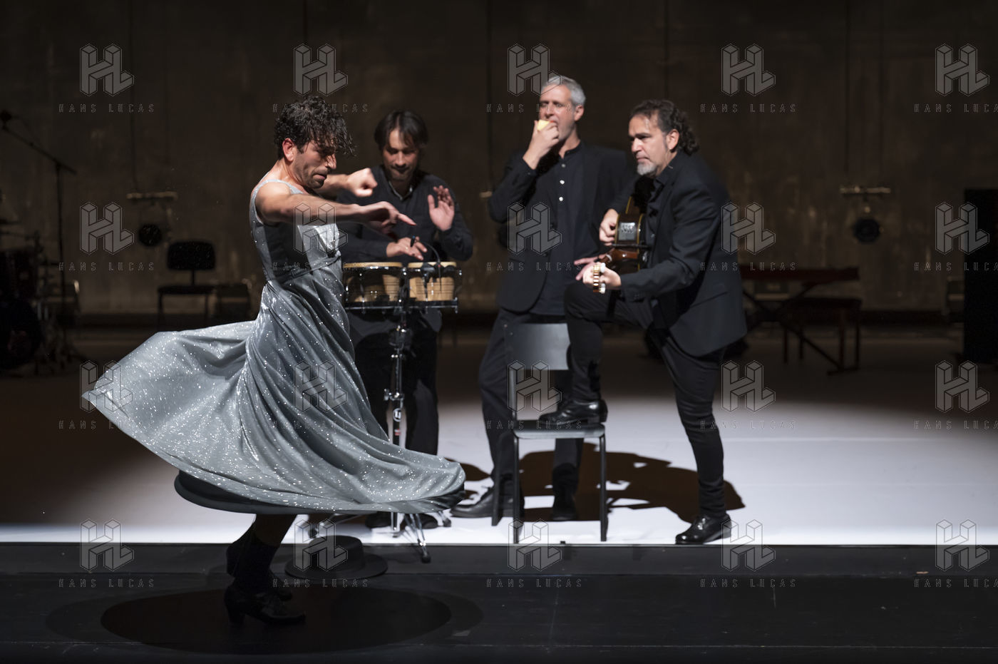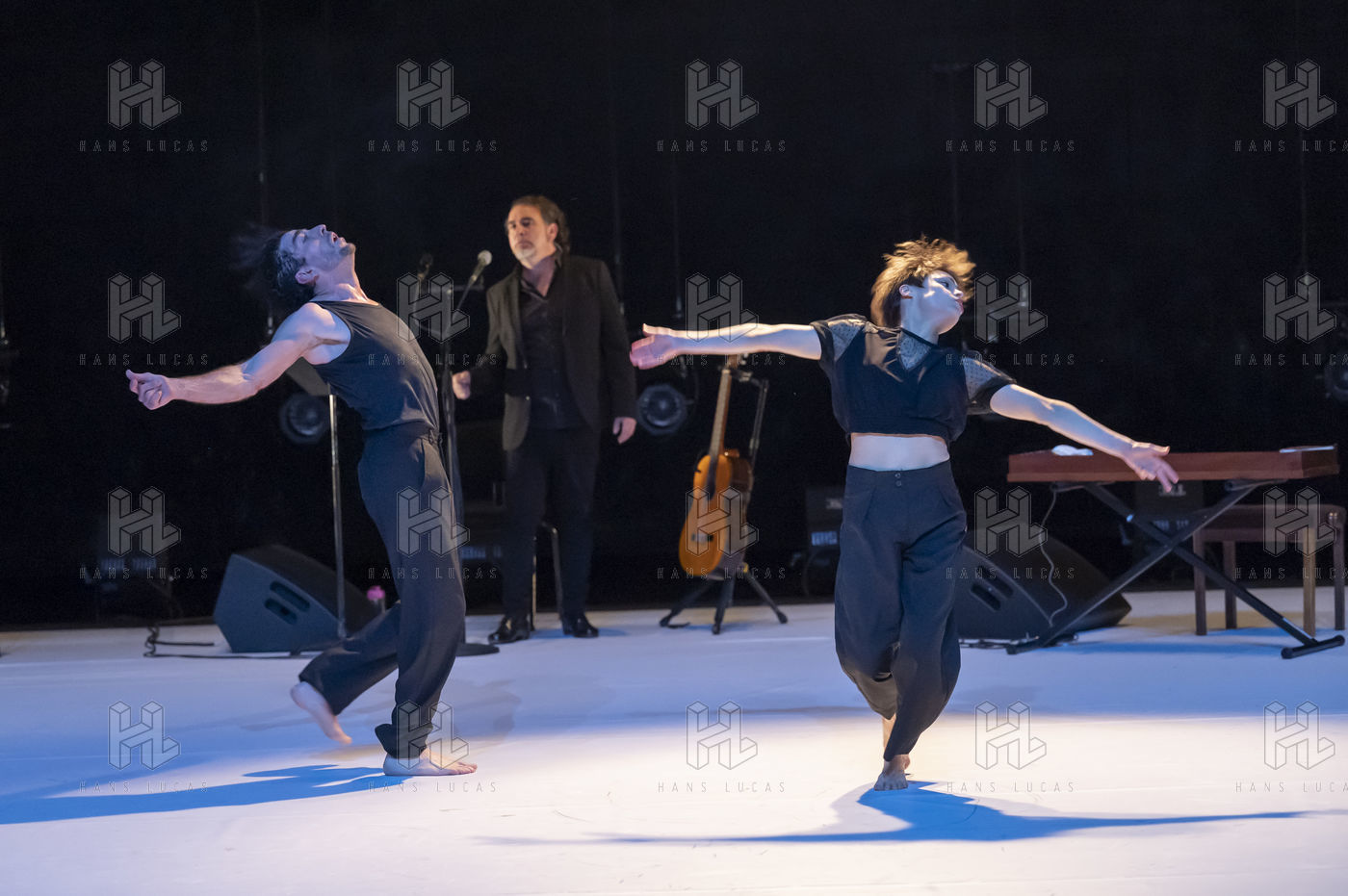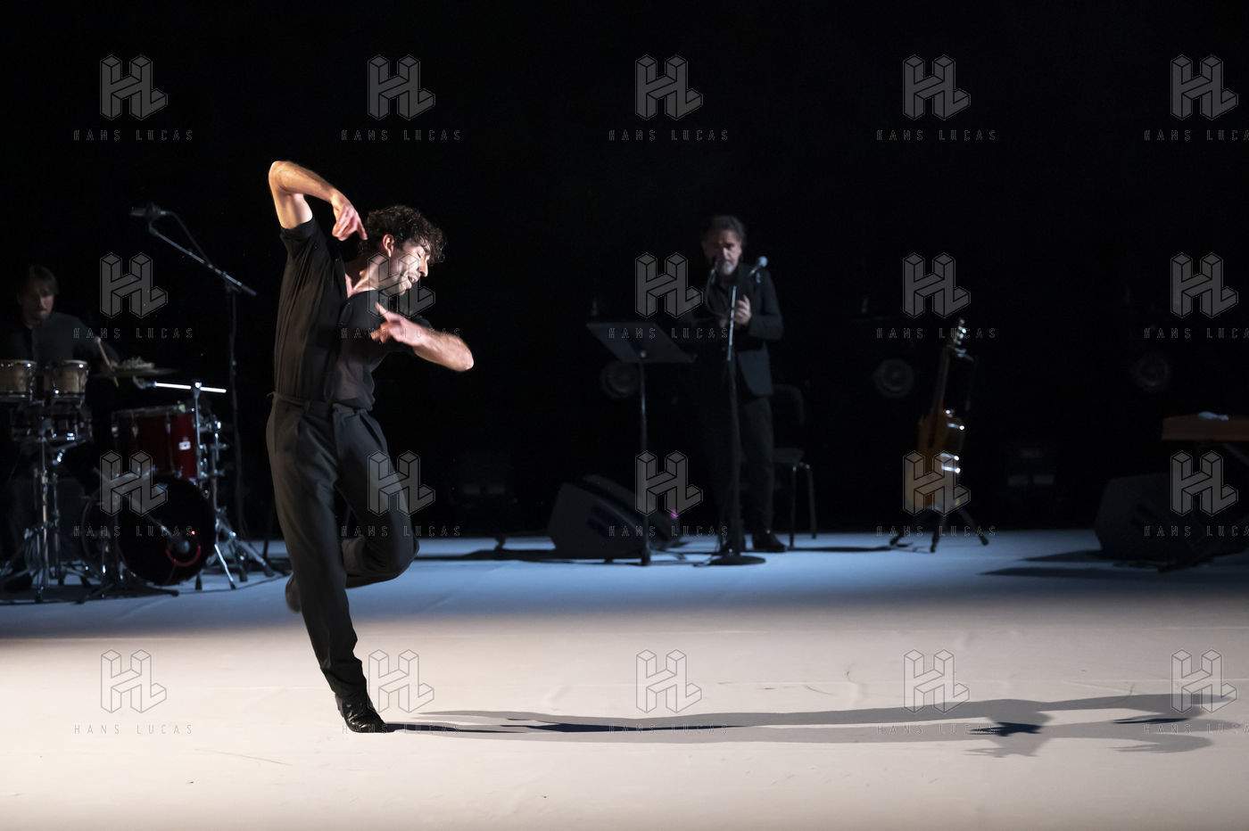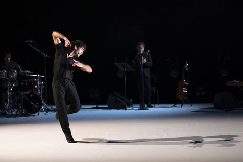 France - Paris - 2022-02-10. IMPERFECTO, choreography, staging, costumes : Jann Gallois, David Coria. Casting : Jann Gallois, David Coria (dance), David Lagos (voice), Alejandro Rojas (piano, clavicord), Daniel Suarez (drums). As part of the Flamenco Art 5th Biennial at Chaillot, Theatre National de la Danse, Paris - 2022-02-10. Photography by Nathalie VU-DINH / Hans Lucas.