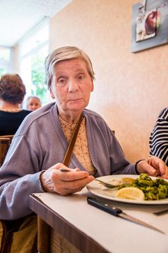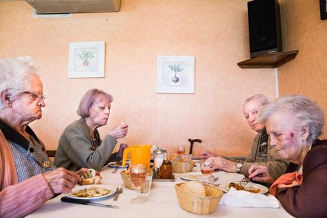 Manger, ce geste qui pour beaucoup n'a plus aucune valeur, a, pour les personnes vivant à la Maison des Roses une importance particulière. Le repas du midi est le moment ou elles sortent de leur chambre. L'excuse qu?elles ont pour se retrouver ensemble, la raison pour laquelle elles choisissent de mettre un joli pull le matin.