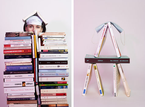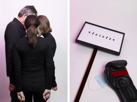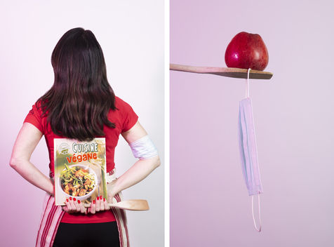 Pour ma part, ma série « Diptyque : confinement de J4 à J13 » met en scène au jour le jour - du vendredi 20 au dimanche 29 mars, des sujets partagés par le plus grand nombre : les courses, la cuisine, la lecture, le sport, les applaudissements de 20h00, les réseaux sociaux et la famille. Au vu de la frayeur auprès de la mienne qui disparaissait de mon champ dès que je sortais mon appareil photo - à peine n'allait-elle pas se cacher sous le lit ou dans les placards - l'autoportrait s'est imposé... Quant au choix de la date finale, il est également tombé naturellement. Ma série s'est arrêtée à l'unique prise de vues de ma fille et de mon mari. C'était la négociation pour qu'ils acceptent que je les photographie. Il faut dire que pendant ces dix jours de confinement, j'avais transformé la pièce principale en studio avec son fond, ses éclairages et les stores fermés...