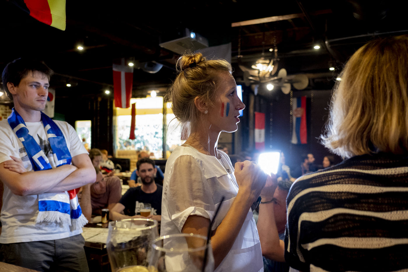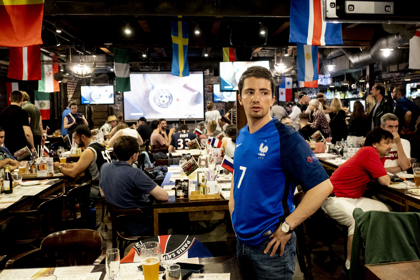 Dans le Gastrobar dans le sud ouest de Moscou, les expatriés français en Russie sont venu regarder les huitièmes de final de la coupe du Monde de Football 2018 qui les opposent à l'Argentine. Après un match complètement fou, les français ont réussi à garder leurs avances et à gagner pour s'offrir les huitièmes de finales.