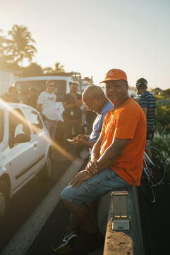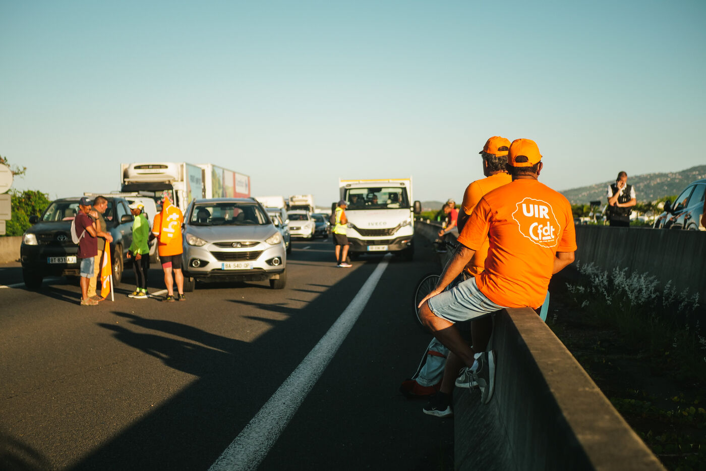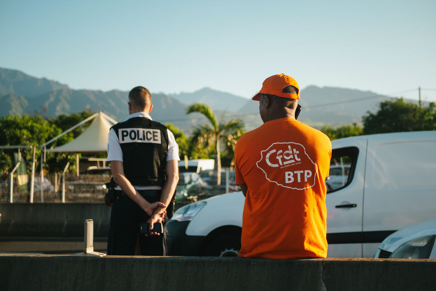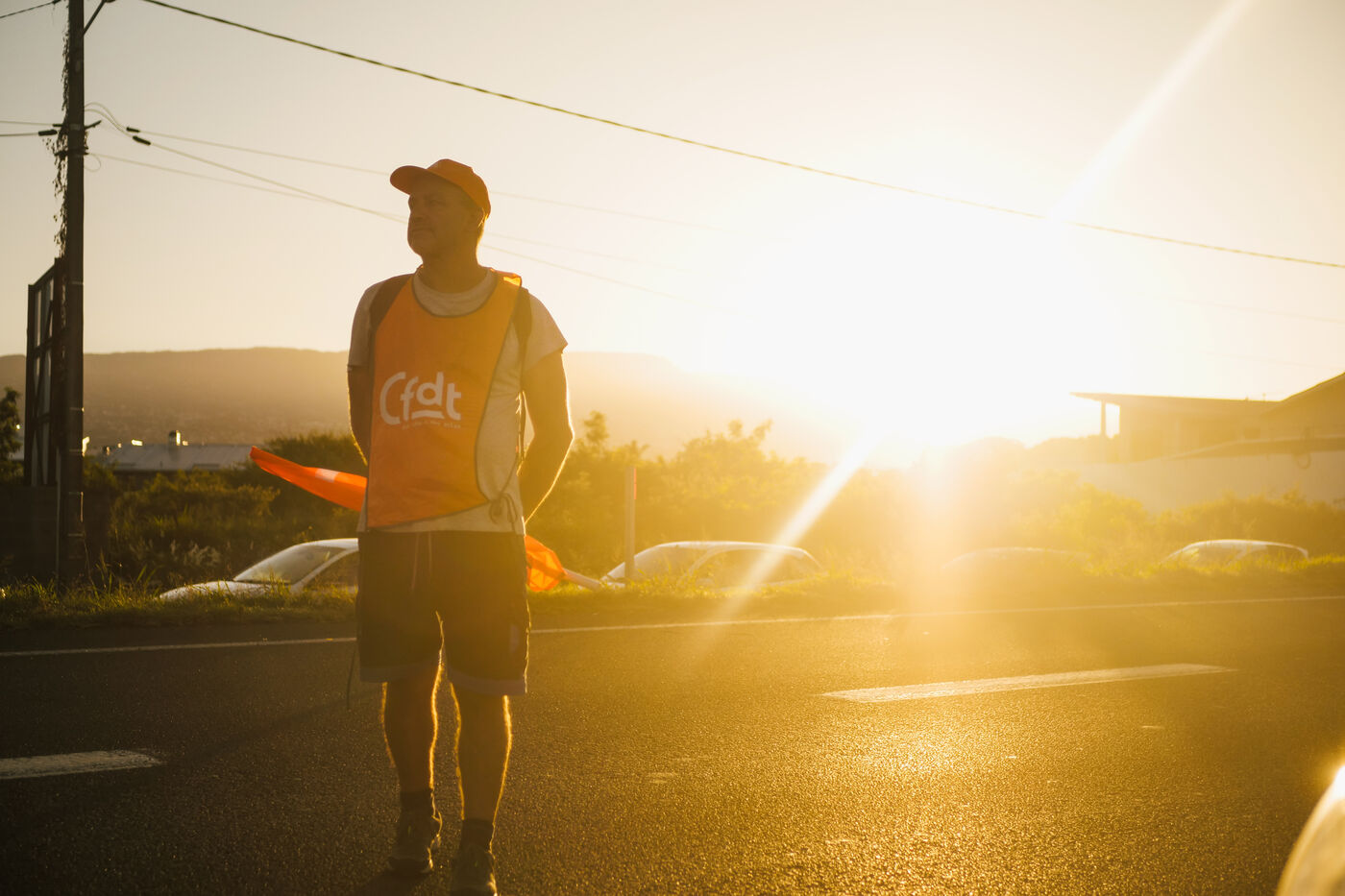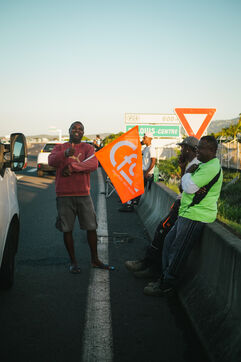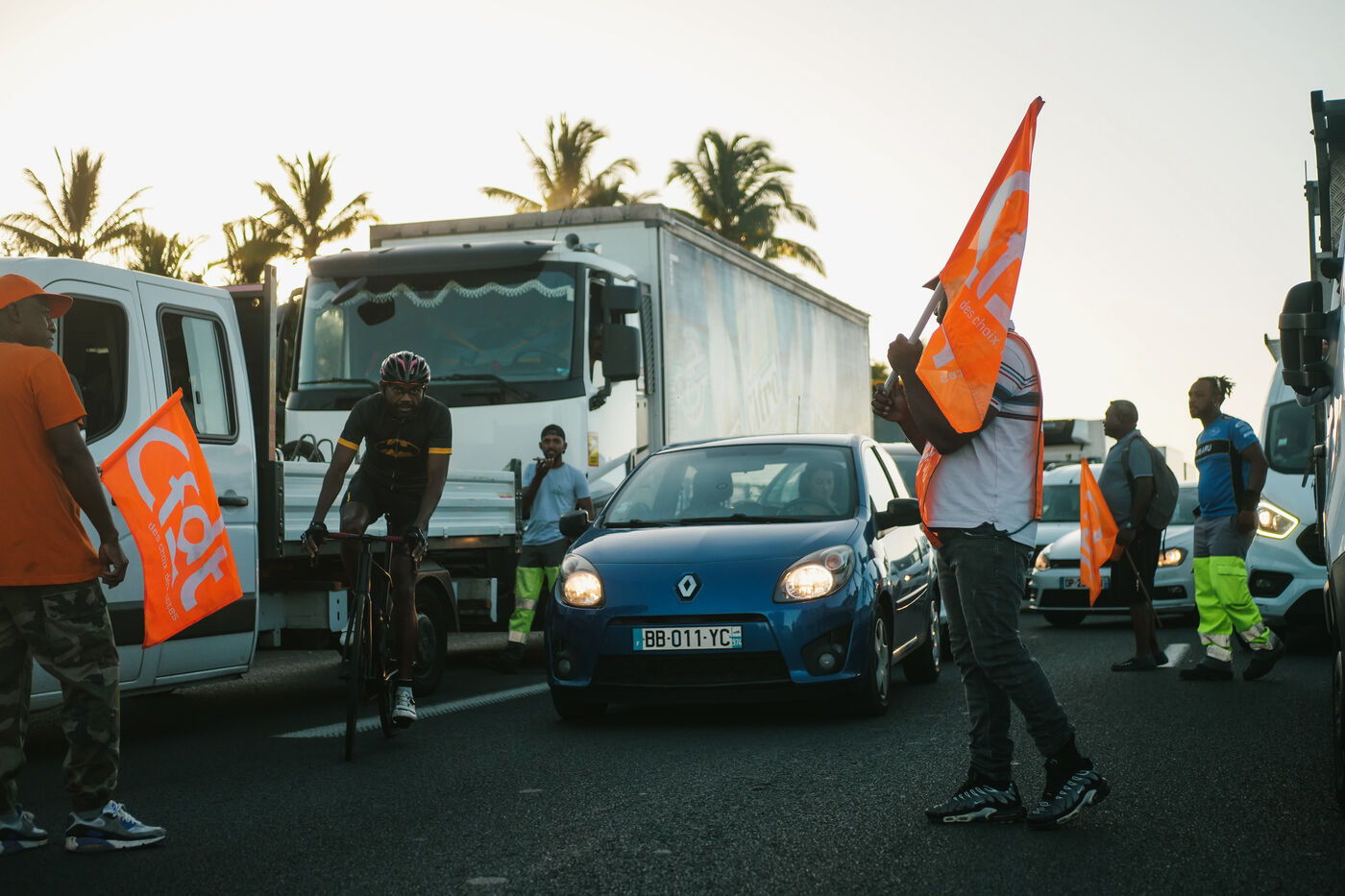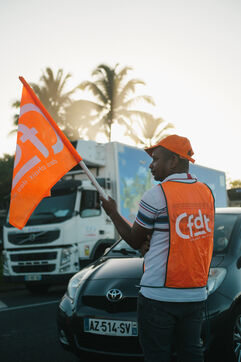 New road blockade in Saint Pierre, in the south of Reunion Island, during the 9th day of national mobilization to protest against the pension reform. This reform was definitively adopted in Parliament on March 20, 2023, after the Borne government used the 49.3 article. Emmanuel Macron spoke publicly on March 22, the day before this 9th day of mobilization. Here, in Pierrefonds (Saint Pierre), several members of the CFDT decided to block the main road axis, from dawn. Traffic jams were formed very quickly but motorists showed understanding. No tension was observed.