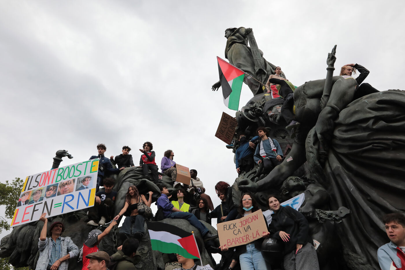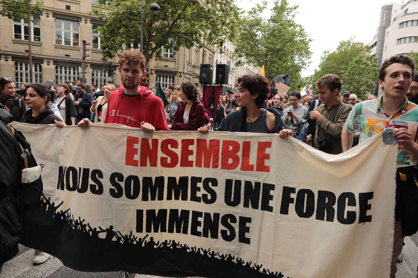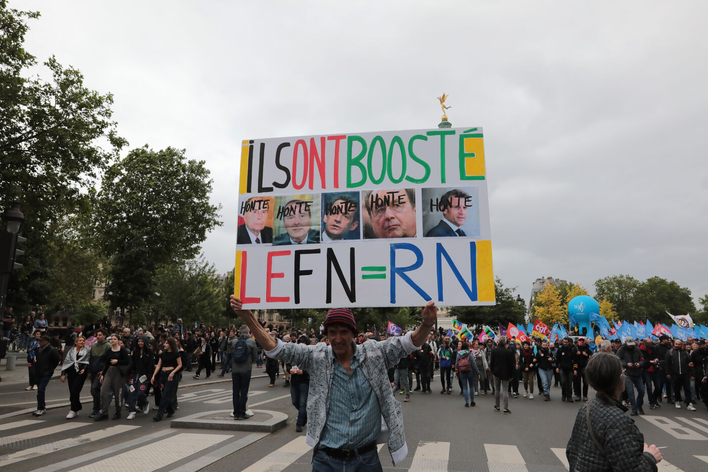 Des dizaines de milliers de personnes ont manifesté à Paris à l appel du Nouveau Front Populaire et des syndicats contre la montée de l Extrême Droite aux récentes élections européennes et le Rassemblement National de Marine Le Pen et avant les élections législatives anticipées en France.