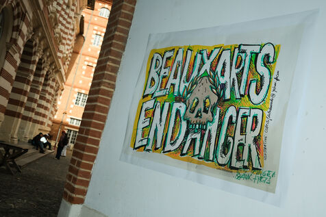 Toulouse, France, 2023-02-01. The students and staff of ISDAT (formerly Beaux-Arts) organised a morning of mobilisation before their board meeting. They are protesting against insufficient resources, even though the institution includes graphic arts, design, music and dance. The 2022 budget would be lower than the 2012 one. They welcomed the board members with a hurdle of dishonour.