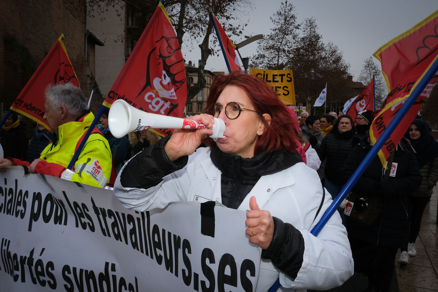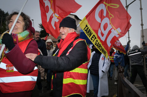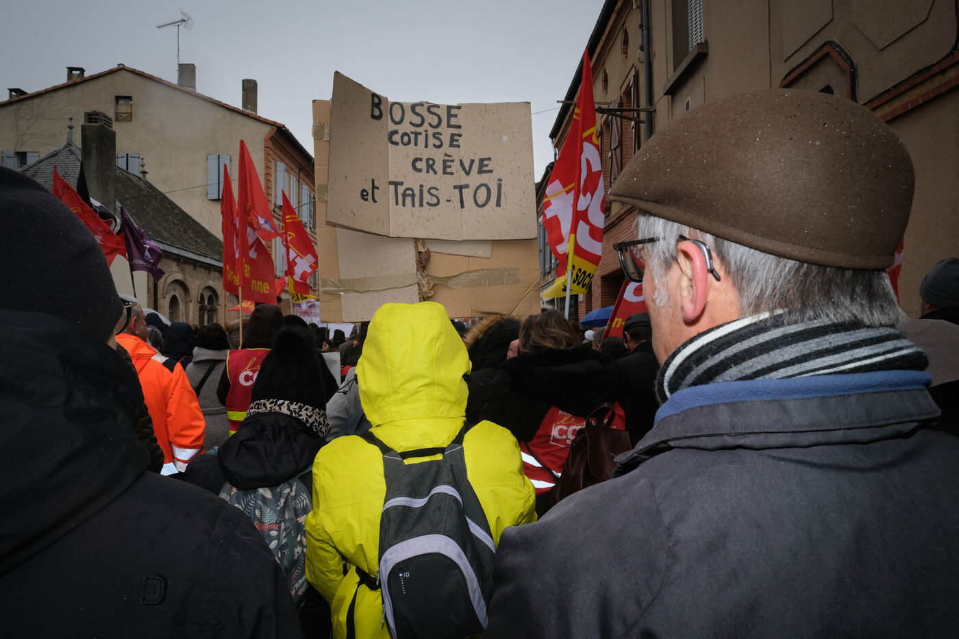 Montauban, France, 2023-02-07. Troisième journée de manifestation nationale contre la réforme des retraites. Suivant l'appel de tous les syndicats, et au moment où est débattu le projet de loi à l'assemblée nationale, la foule s'est données rendez-vous jusque dans les petites villes, comme ici à Montauban (60 000 habitants).