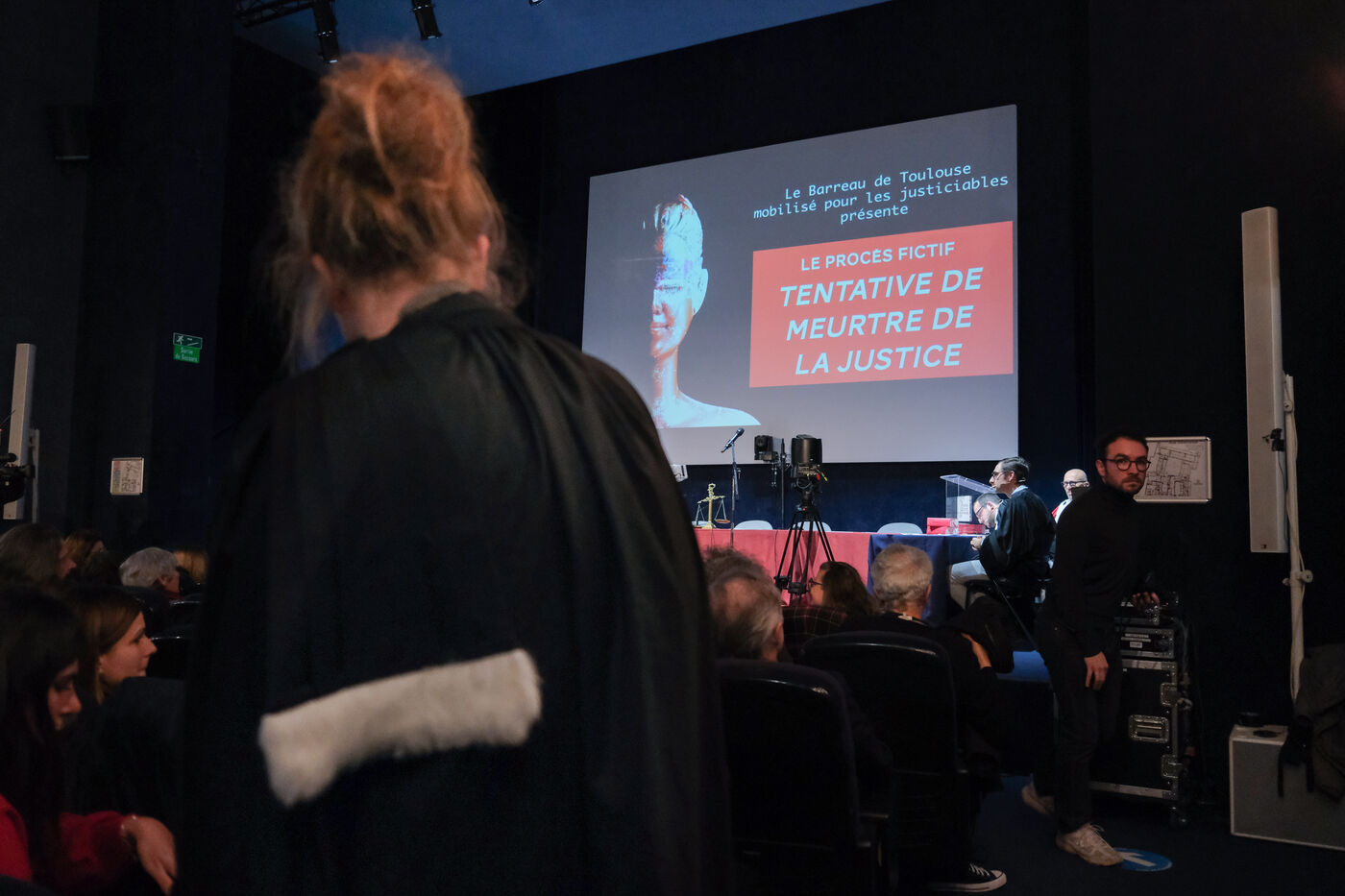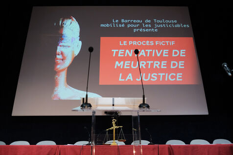 Toulouse, France, 2023-02-08. The magistrates, clerks and lawyers of Toulouse organised a mock trial, in which the state would be prosecuted for "Attempted murder of Justice". Numerous witnesses took the stand to testify about their unrest at work (lack of material and human resources, overtime, unreplaced absences, lengthy procedures, etc.).