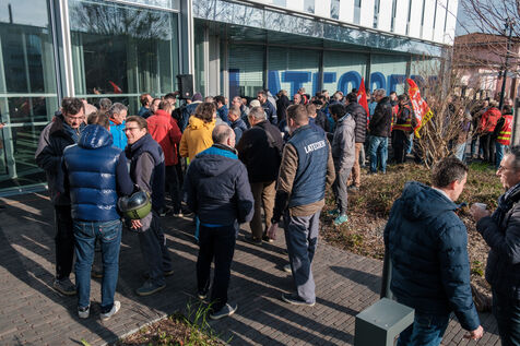 Toulouse, France, 2023-02-15. Rassemblement de salariés devant le siège social du Groupe Latécoère, et rencontre avec la Direction. L'activité du site de Toulouse - Monredon, inauguré en 2018 et regroupant plus d'une centaine de salariés, devrait être délocalisée au Mexique et en Tchéquie, et le site de Toulouse - Labège devrait fermer.