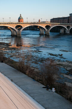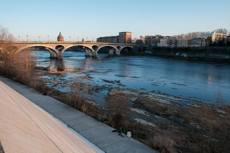 Toulouse, France, 2023-02-20. With no rainfall for thirty days now, the winter drought is affecting all regions of France. In the south west, the Garonne has a flow of one third of the normal level for the season. This extreme low level, already experienced last summer, is visible in the pink city.