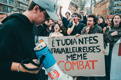 Toulouse, France, 2023-03-23. Pour la neuvième fois en deux mois, une manifestation nationale a eu lieu à Toulouse, suivant l'appel de l'intersyndicale. Une foule très nombreuse s'était donné rendez-vous dans la rue, malgré l'adoption de la réforme des retraites par l'article 49.3, et les déclaration du président la veille. La jeunesse (lycéens, étudiants) était également très présente.
