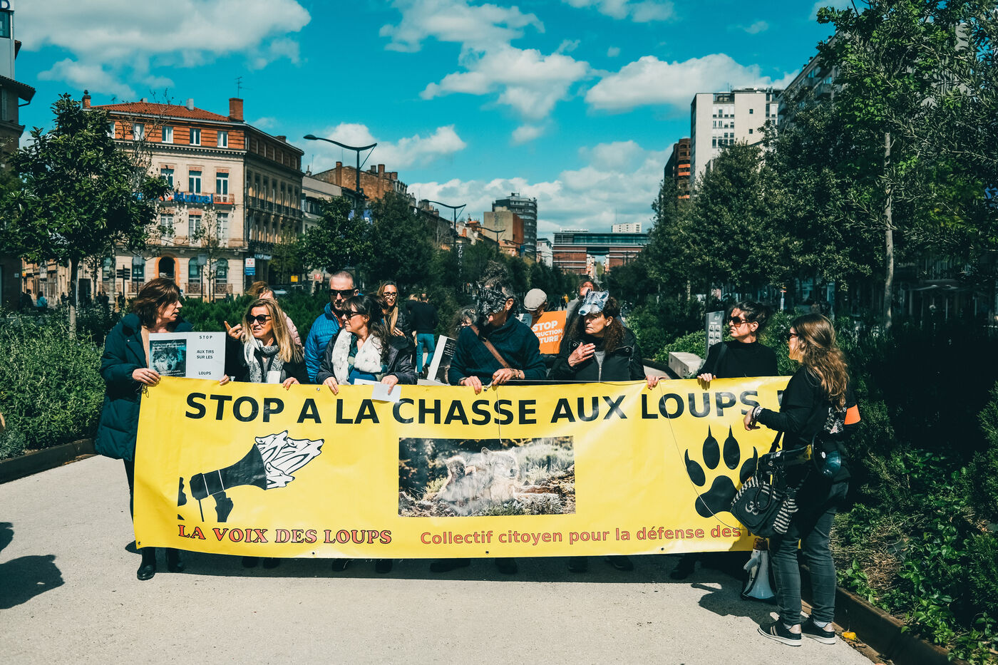 Toulouse, France, 2023-03-15. Le collectif "La Voix des loups" a organisé un rassemblement, suivi d'une déambulation dans la ville, pour protester contre le recours à des "tirs de prélèvement", létaux, contre ces animaux pour protéger les troupeaux d'ovins. Malgré son statut d'espèce protégée par l'Union Européenne, le gouvernement français a depuis 2018 et le Plan Loup autorisé le "prélèvement" d'individus, pour protéger les troupeaux. Mais l'association dénonce des tirs de prélèvements aléatoires, qui ne résolvent rien et qui ne sont fondés sur aucune expertise scientifique. Des alternatives d'effarouchement ou de protections efficaces existent, mais ne sont pas utilisées par les éleveurs. En 2023, ce seraient 174 loups qui devraient être abattus.