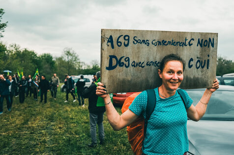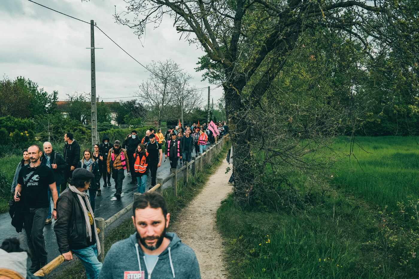 Saix, France, 2023-04-22. A l'appel de différents collectifs, une manifestation contre le chantier de l'autoroute A69 Toulouse-Castres a rassemblé plusieurs milliers de personnes. Soutenu par l'Etat et la Région Occitanie, le projet initié il y a plus de trente ans est l'objet d'une opposition locale massive. Selon eux, l'autoroute serait un chantier anachronique, remplaçant 400 ha de terres agricoles en bitume et béton, et pour un trafic routier insuffisant, un temps gagné faible et un tarif exorbitant. Les opposants proposent une alternative avec l'aménagement de la route nationale N126 déjà existante. La manifestation s'est déroulée dans le calme et sans débordements; un dispositif de 800 gendarmes avait été déployé.