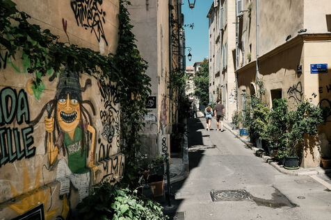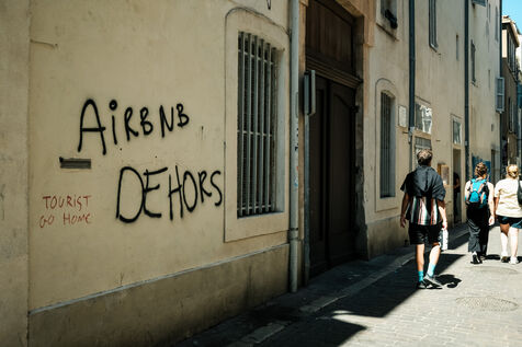 Marseille, Provence-Alpes-Côte d'Azur, France, 2023-08-08. In the working-class district of Panier, in the 2nd arrondissement of the Cité Phocéenne, tags hostile to the famous rental property platform are multiplying. Local residents accuse it, as in other major cities, of encouraging soaring rental prices and a shortage of properties to let.
