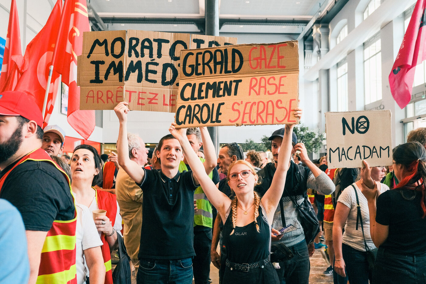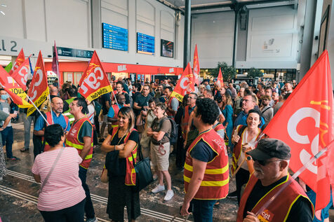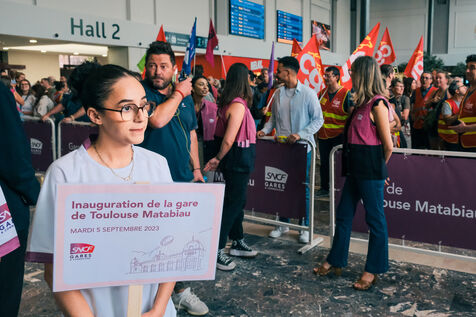Toulouse, France, 2023-09-05. Après trois ans de travaux, la gare SNCF de Toulouse Matabiau a été inaugurée; mais les syndicats de cheminots réunis en intersyndicale ont perturbé la cérémonie, pour défendre le Service Public du ferroviaire (notamment contre le développement des boutiques commerciales dans la gare, l'abandon du frêt, ou la fin du monopole SNCF). Les forces de l'ordre ont été sollicitées pour empêcher les syndicalistes de pénétrer dans la gare. En aparté, la présidente de Région et le président de la SNCF ont signé la nouvelle Convention trains régionaux 2023-2032, et la feuille de route Ambition Commune.