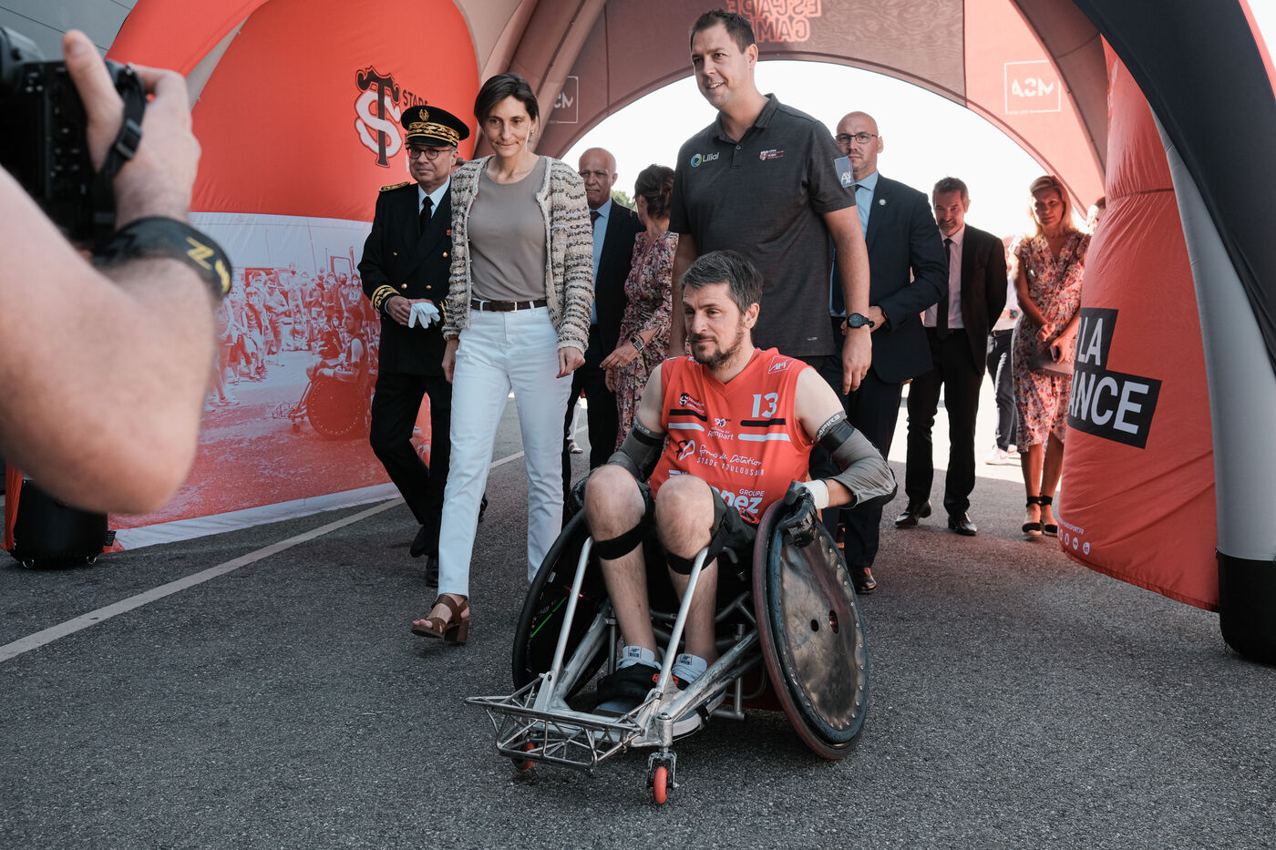 Toulouse, France, 2023-09-10. Amélie Oudéa-Castéra, Ministre des Sports et des Jeux Olympiques, a assisté à un entraînement de la section handirugby du Stade Toulousain Rugby Handisport. Elle s'est ensuite rendue au Village Rugby, plus grande Fan Zone de France, pouvant accueillir 40 000 spectateurs. Elle a ensuite assisté au match de la poule D Japon contre Chili.