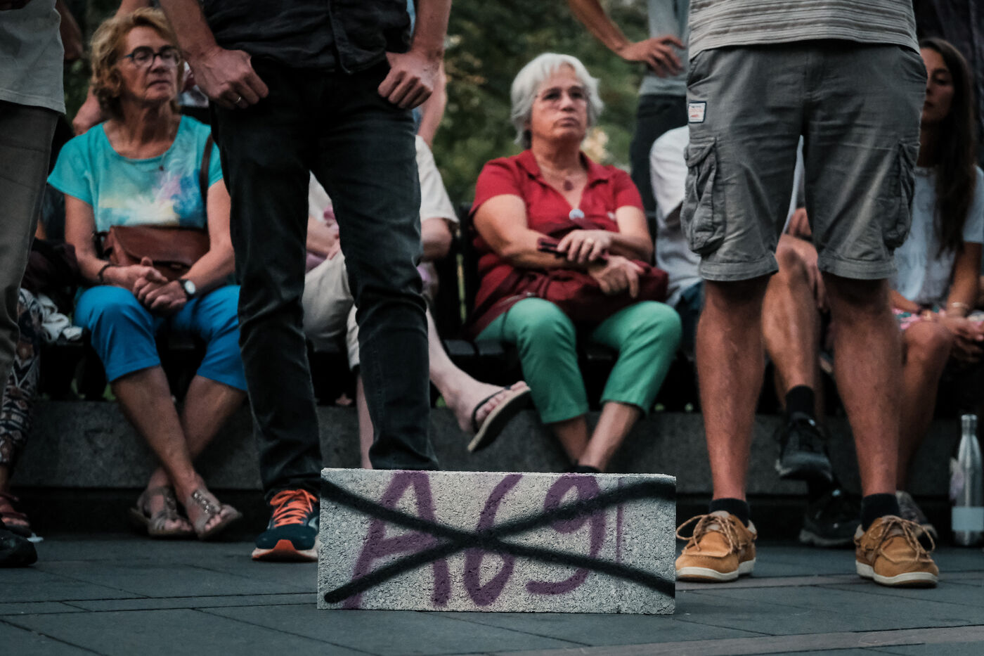 Toulouse, France, 2023-10-09. Rassemblement en soutien aux grévistes de la faim contre le chantier de l'autoroute A69. Parmi ces grévistes, trois ont entamé le jour même une grève de la soif, dont Thomas Brail à Paris après 39 jours sans s'alimenter. Les mains tendues par le gouvernement et la région Occitanie sont à leurs yeux insuffisantes, face à la nécessité de conserver les arbres et terres fertiles, au moment où les effets du changement climatique apparaissent indéniable. Ils ont souhaité respecté une veillée funèbre pour symboliser l'enterrement de l'Etat de Droit.