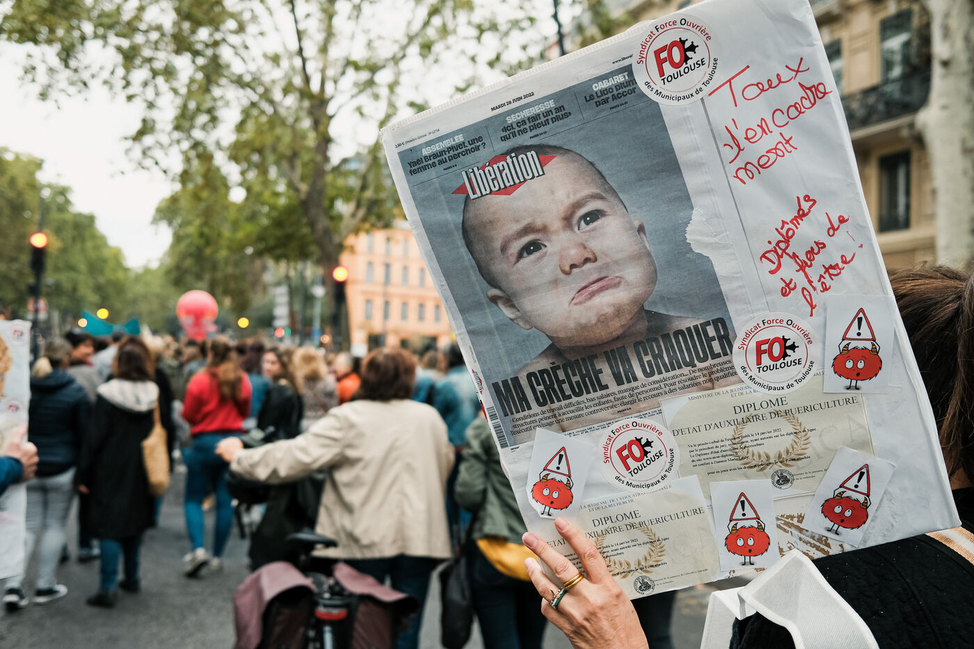 Toulouse, France, 2023-10-19. Childcare professionals marched through the streets of Toulouse under the slogan "Pas de bébés à la consigne" ("No babies in the locker"). They deplored the shortage of staff, and called for a 1:5 staffing ratio, as well as improved pay, hardship and working conditions, at a time when the statements made by the Minister for Solidarity and Families seemed vague to them. The FO, Sud and SNES FSU unions from the local and municipal authority branches were represented.
