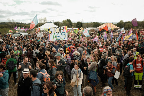 Saïx, France, 2023-10-21. Major demonstration and weekend of action against the Toulouse-Castres A69 motorway construction site. After months of opposition, including a hunger strike by several people, the worksite is moving ahead despite everything. To oppose it, nearly 10,000 people, according to the organisers, demonstrated under slogans such as "We are all eco-terrorists" and "No Macadam".