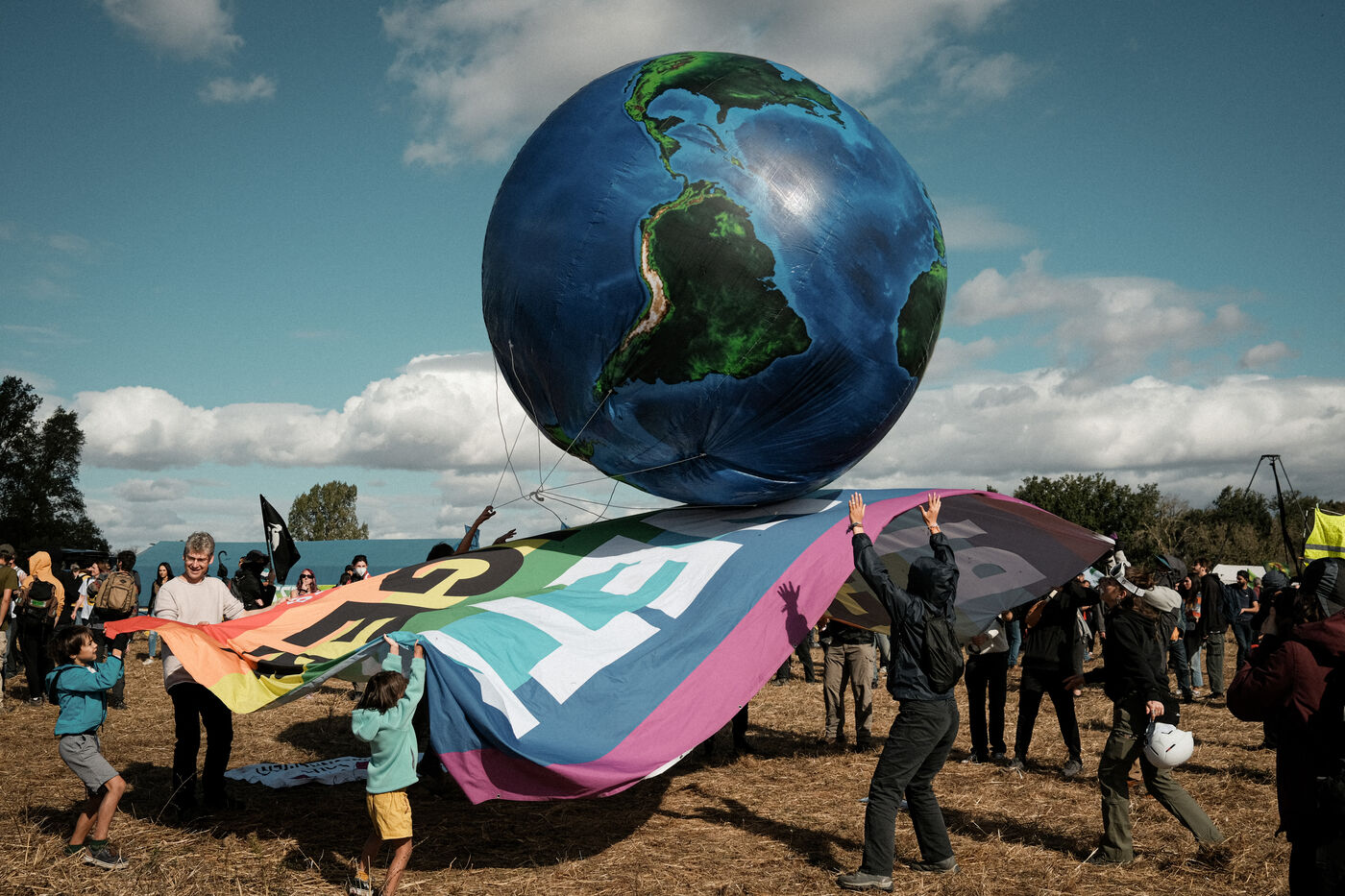 Saïx, France, 2023-10-21. Grande manifestation et week-end de mobilisation contre le chantier de l'autoroute A69 Toulouse-Castres. Après des mois d'opposition, juqu'à la grève de la faim de plusieurs personnes, le chantier avance malgré tout; pour s'y opposer, près de 10 000 personnes, selon les organisateurs, ont manifesté sous des slogans "Nous sommes tous des éco-terroristes" ou "No Macadam".