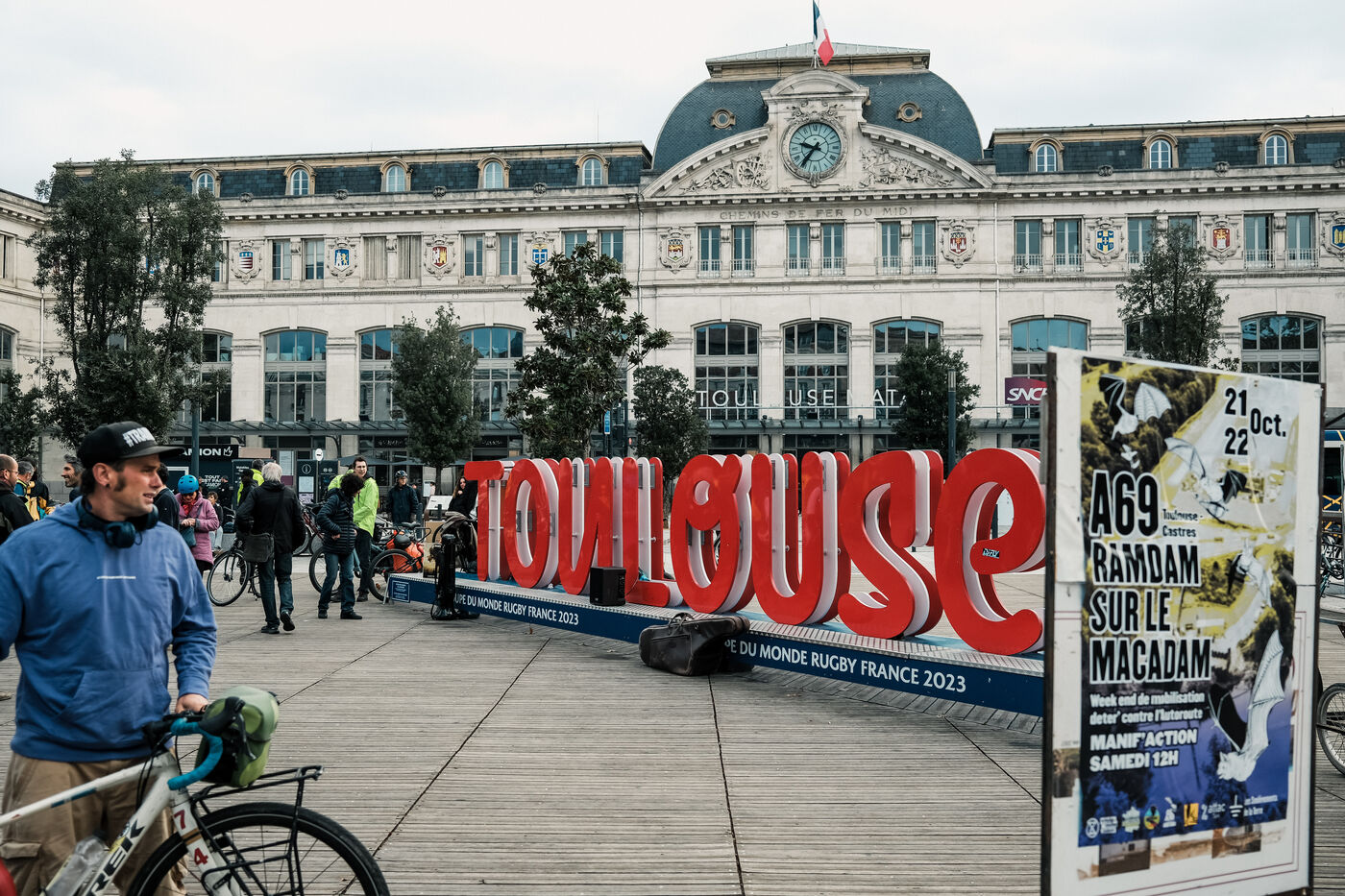 Toulouse, France, 2023-11-01. Mobilisé contre le chantier de l'A69, le collectif La Voie Est Libre a lancé le départ du Cyclotour avec une centaine de personnes sur le parvis de la gare Matabiau. Cette tournée pour une alternative à l'autoroute suivant son tracé rejoindra à vélo Castres en 4 journées, ponctuées par des soirées concert et spectacles.