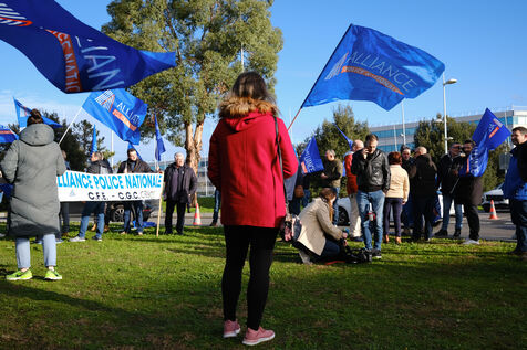Blagnac, France, 2024-01-18. In the face of the deteriorating working conditions that are being forecast for the Paris 2024 Olympic Games, the Alliance union (Police Nationale) is organising a "Black Thursday" and a "strike of zeal", with a rally in front of Toulouse-Blagnac airport.