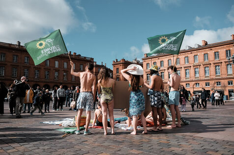 Toulouse, France, 2024-02-24. Un groupe de Jeunes Ecologistes a mené une action symbolique sur la place du Capitole : se mettre en maillot de bain, au c?ur de l'hiver, pour dénoncer l'inaction des institutionnels (mairie, métropole, et Etat) face au dérèglement climatique.