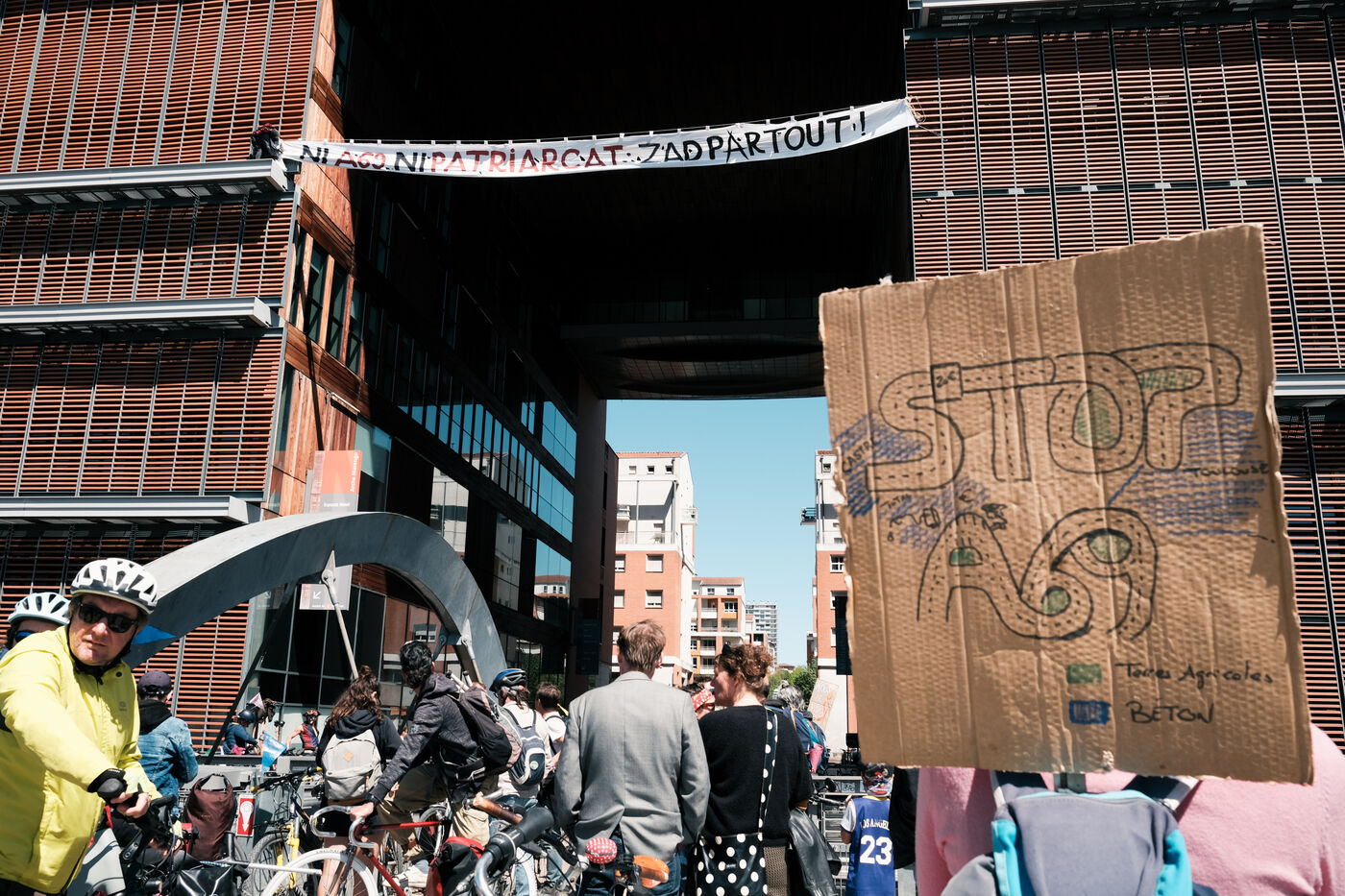 Massive demonstration of opponents of the construction of the A69 motorway in Toulouse, southwest of France, on April 21, 2024. Leaving Castres a week earlier, a caravan of cyclists ended in the pink city on their journey to show alternative mobility to the A69.