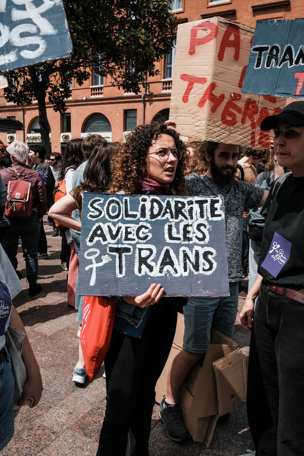 Rally organized by the Act Up association against transphobia in Toulouse, southwest of France, on May 5, 2024. Proposed laws put forward by right and far-right parties aim to prevent gender transitions of minors and legalize conversion therapy.
